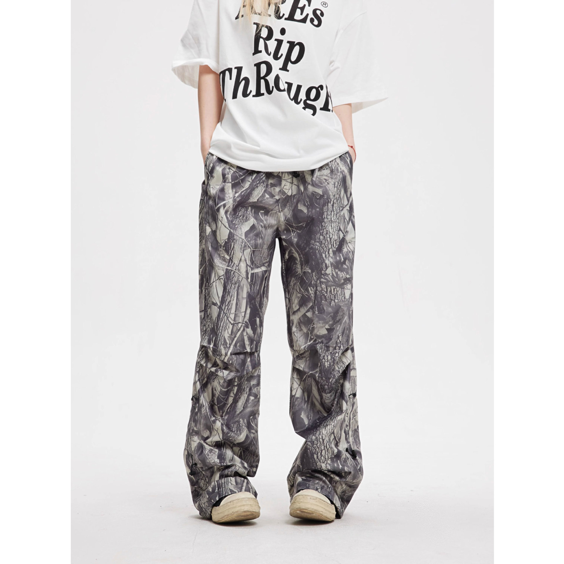 树枝迷彩直筒垂坠感工装休闲长裤阔腿男春秋季新款抽绳机能伞兵裤