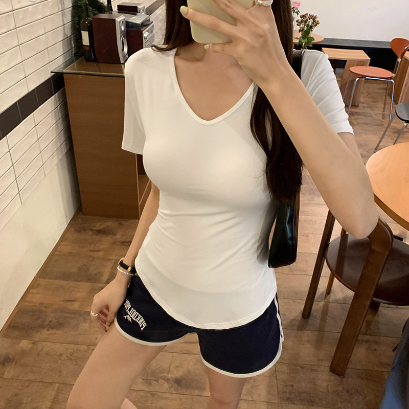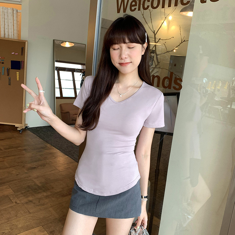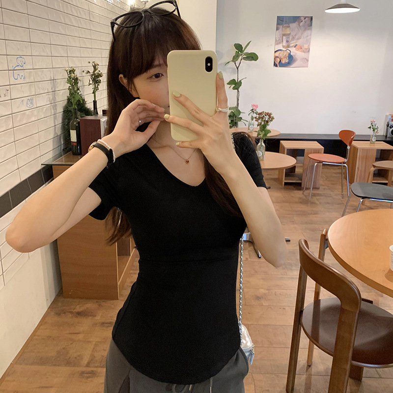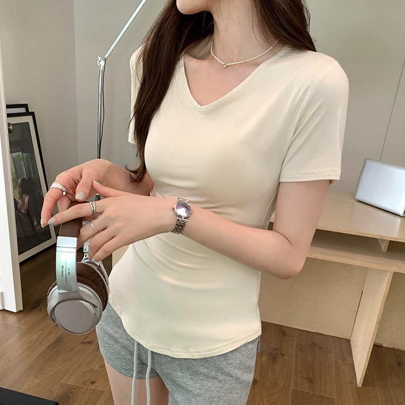 莫代尔收腰V领短袖t恤女夏新款爆款修身显瘦小众独特别致上衣
