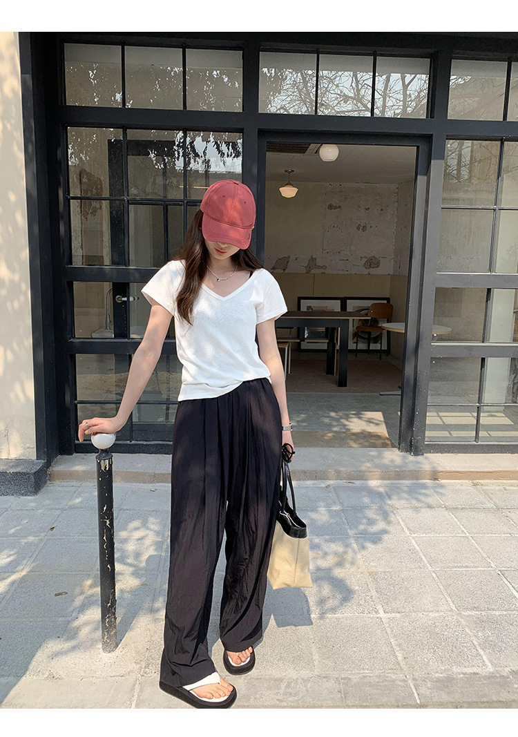 螺纹V领纯色短袖T恤女春夏年新款内搭小个子体恤百搭修身上衣