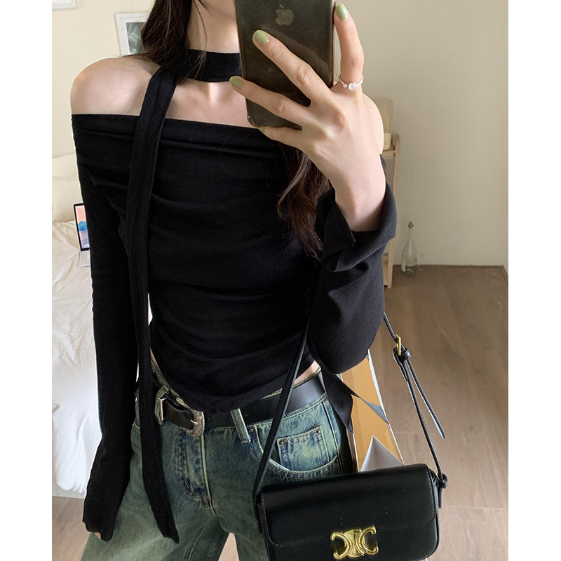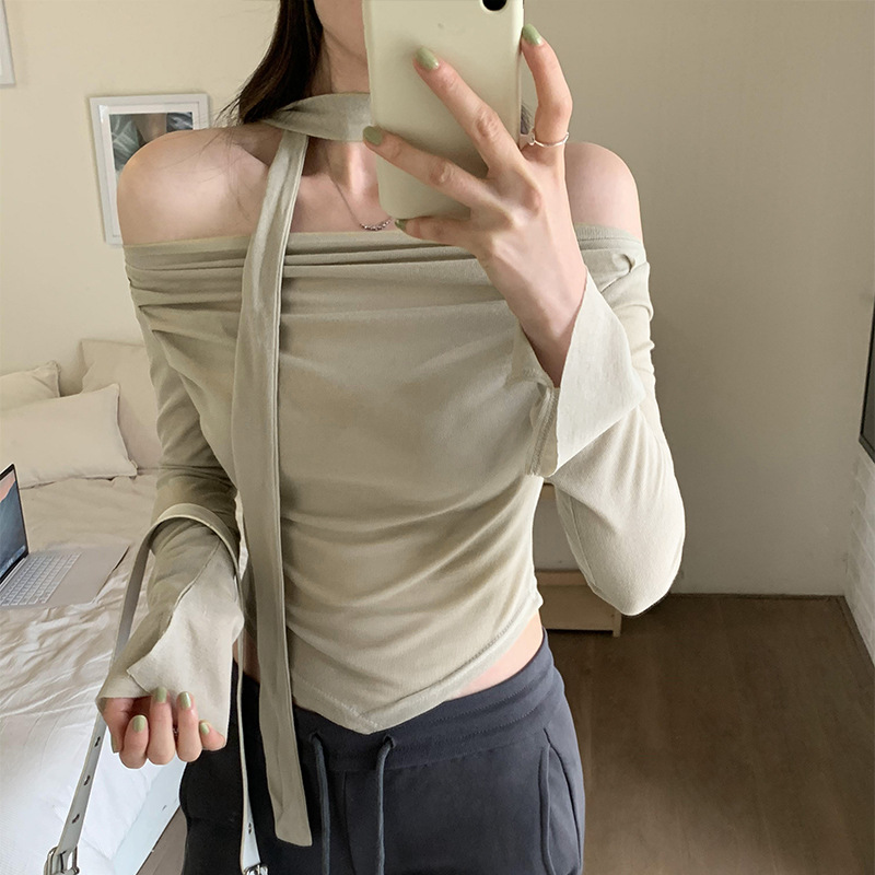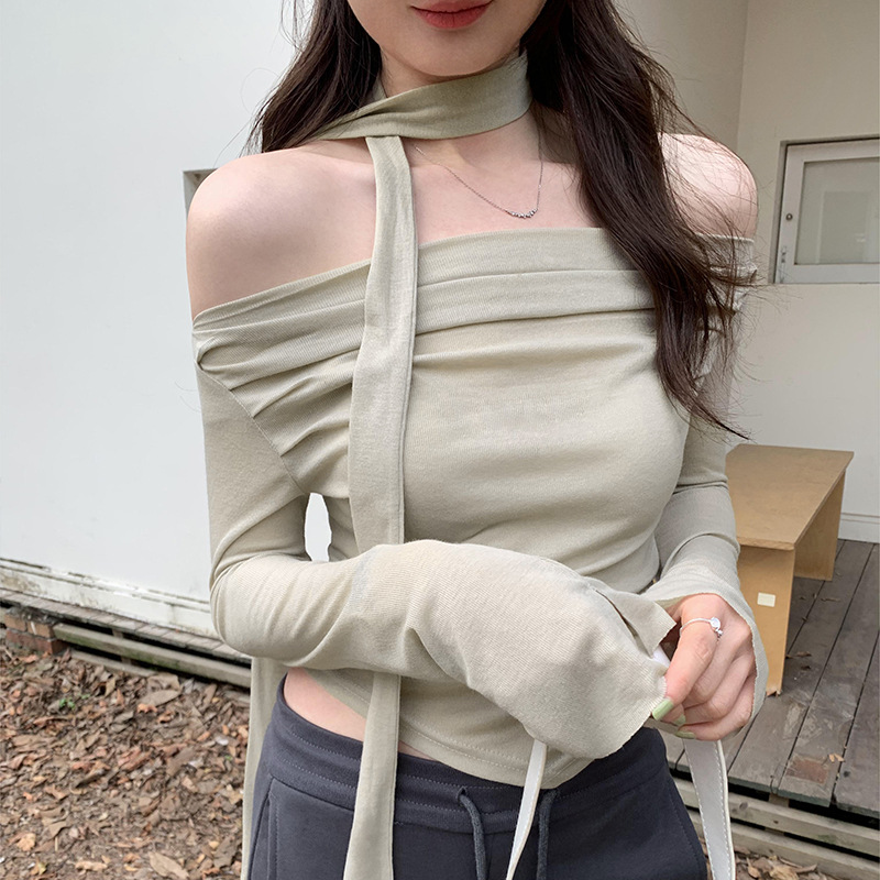 一字肩显瘦短款长袖t恤女春秋季新款高级感辣妹上衣围巾套装