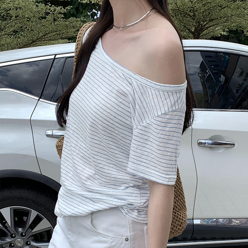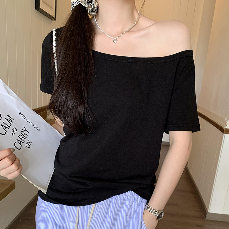 今年流行的漂亮气质露肩宽领短袖T恤女夏季新款百搭上衣