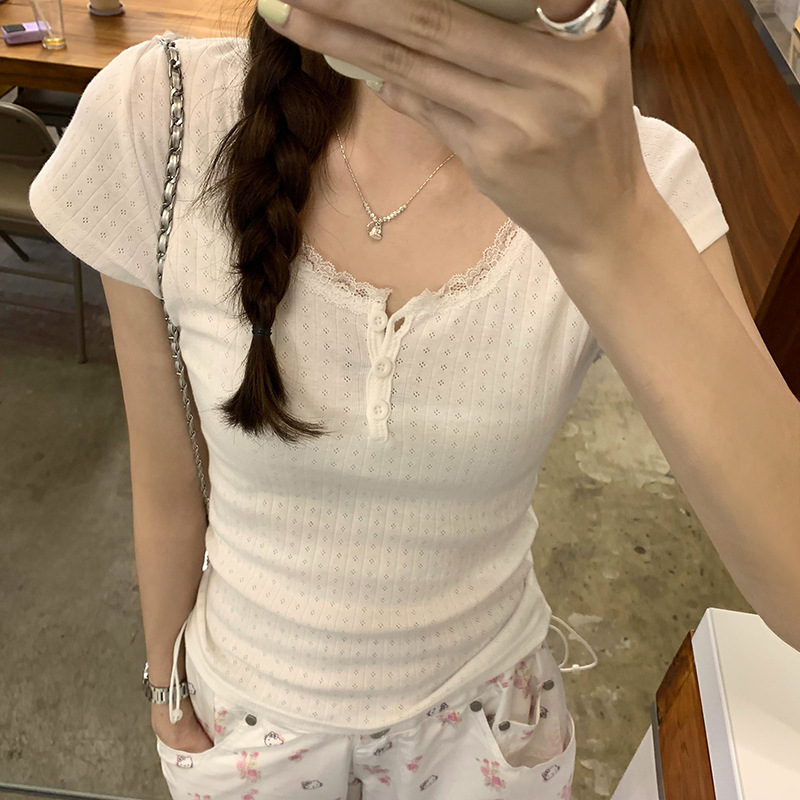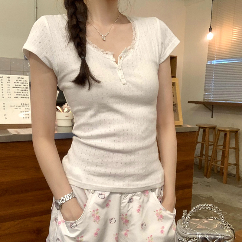 纯欲甜美气质蕾丝花边白色纯棉短袖T恤女夏季新款修身正肩短上衣