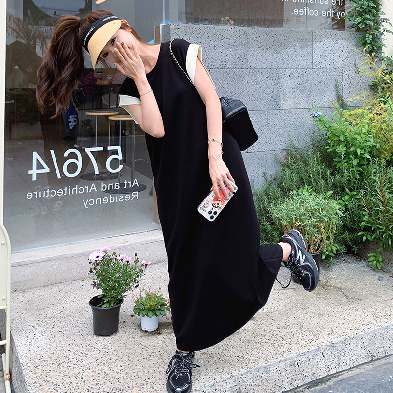 法式简约撞色无袖背心裙新款圆领A字宽松显瘦优雅休闲连衣裙