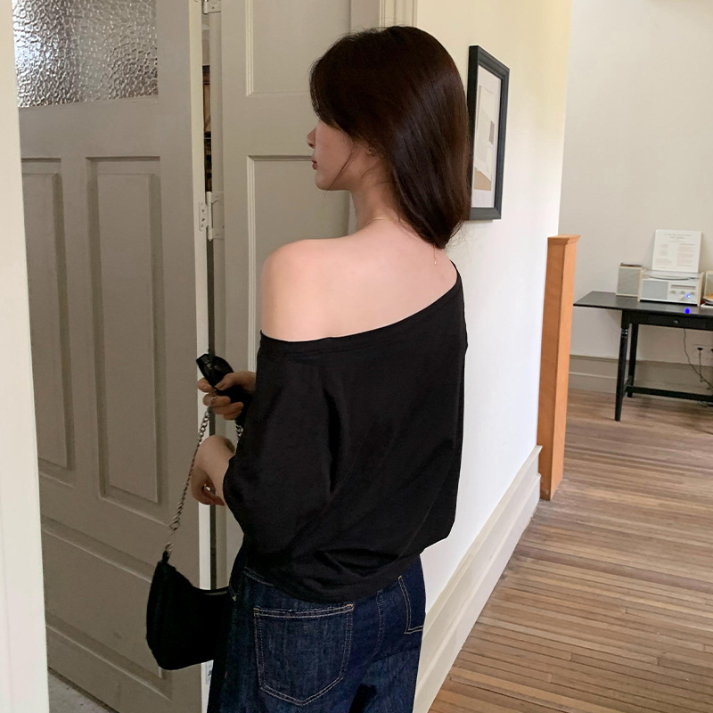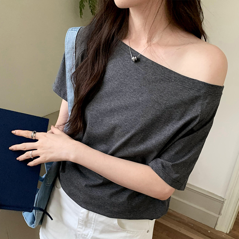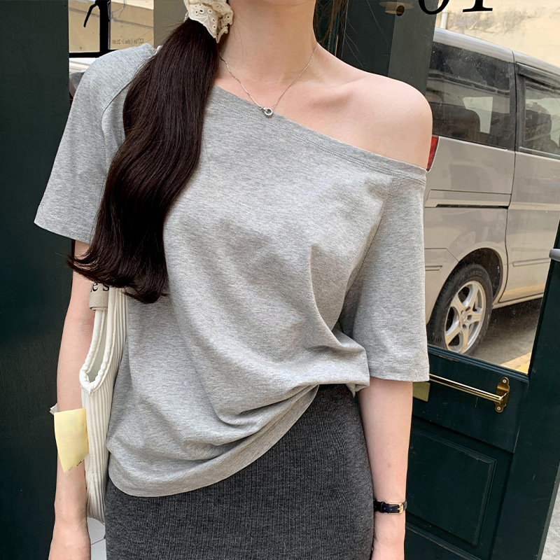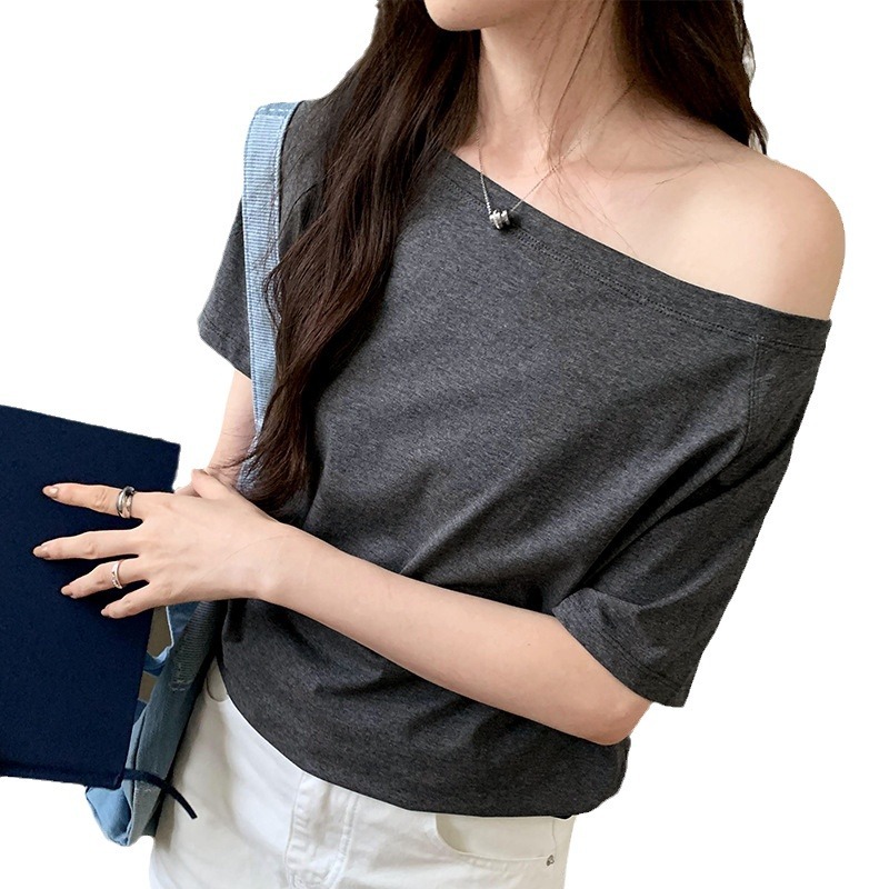 明星同款一字领斜肩短袖T恤女夏季新款宽松慵懒风高级感上衣