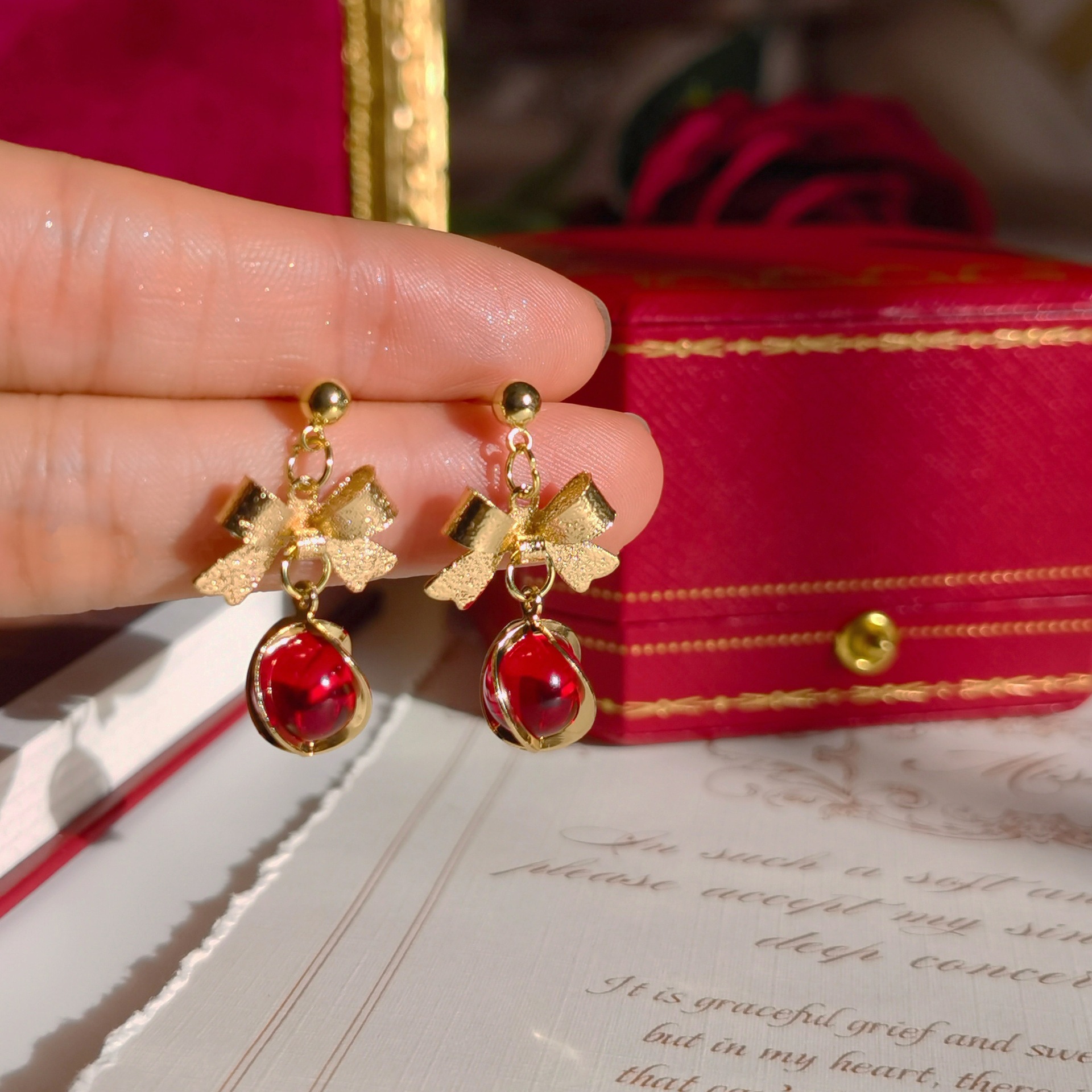 「星光琉璃夜」夏天温柔复古小众金色蝴蝶结红色浆果耳环/耳夹女