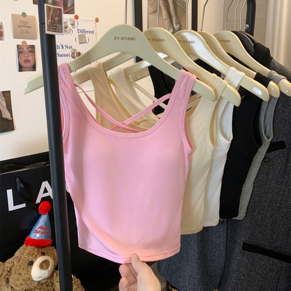 百搭甜辣风宽肩方领交叉吊带背心自带杯垫聚拢修身显瘦可外穿内搭
