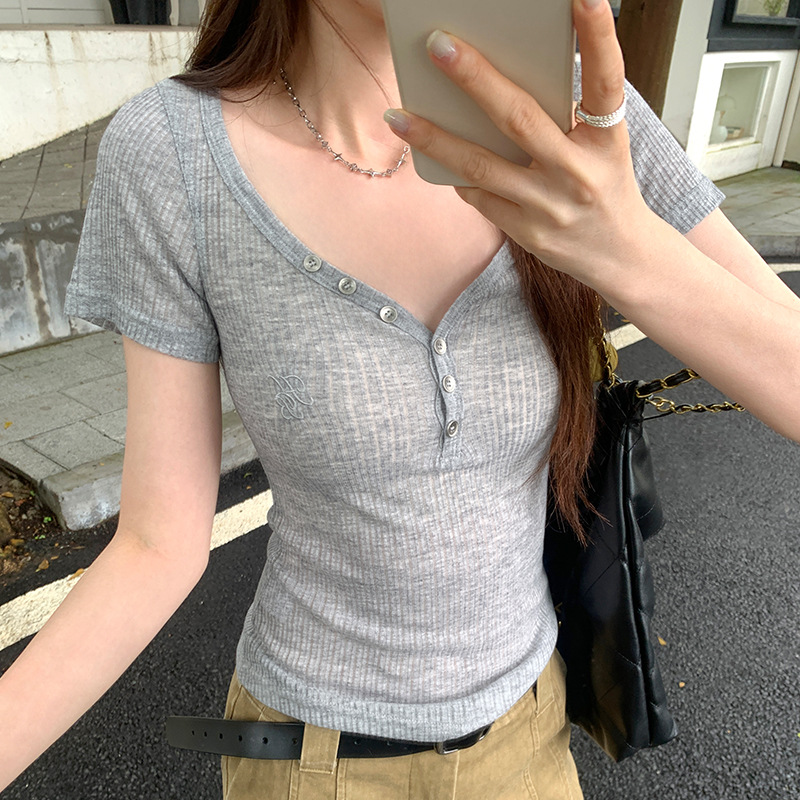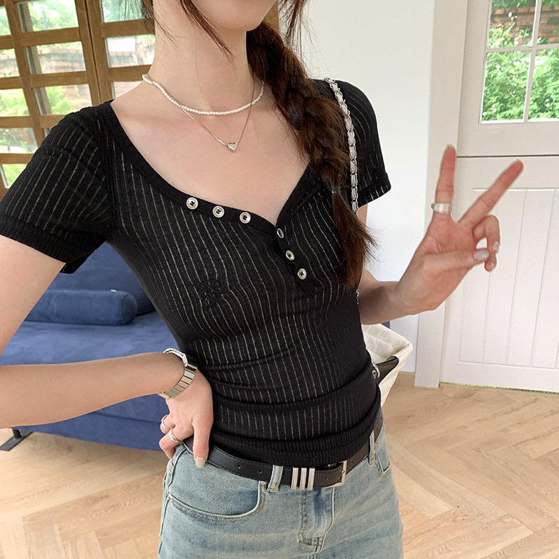 薄款微透正肩半排扣短袖T恤女夏季新款修身纯欲性感辣妹上衣