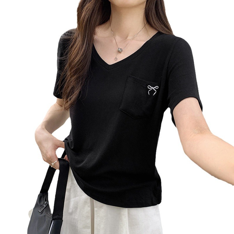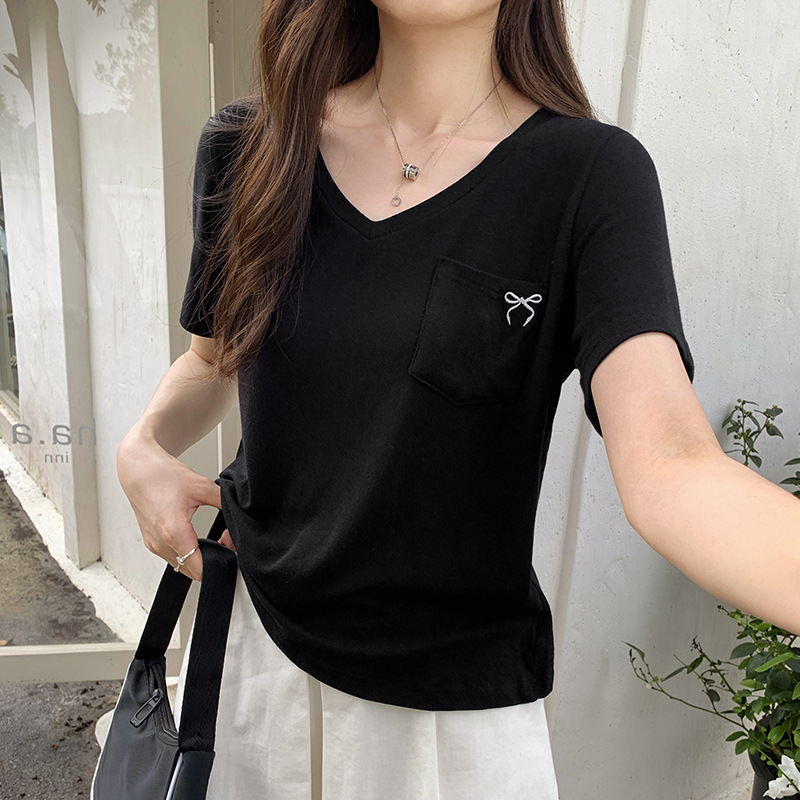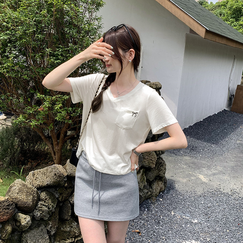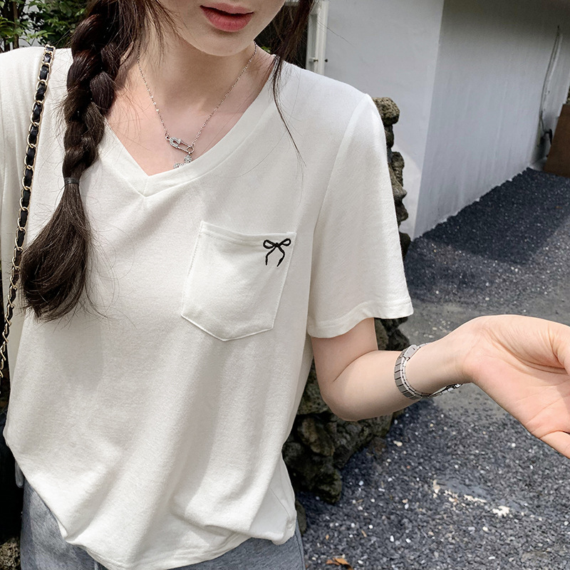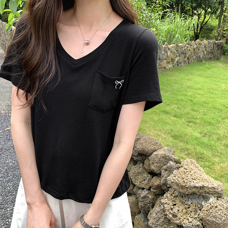 小众设计感口袋装饰印花V领短袖T恤女夏季新款韩系宽松气质小上衣