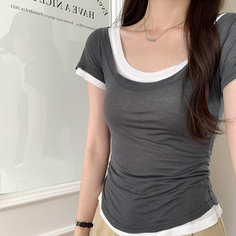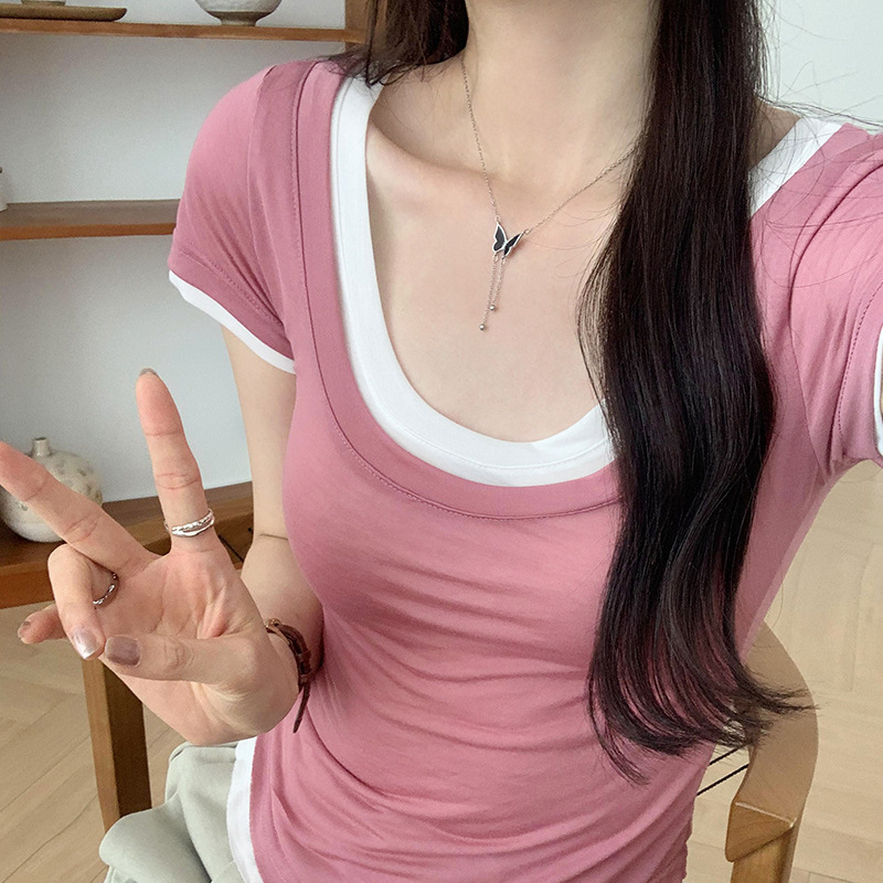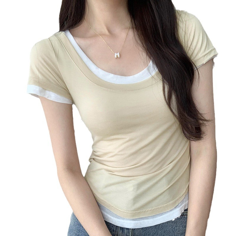 甜辣修身显瘦短袖T恤女夏新款两件套装撞色叠穿绝美韩系上衣