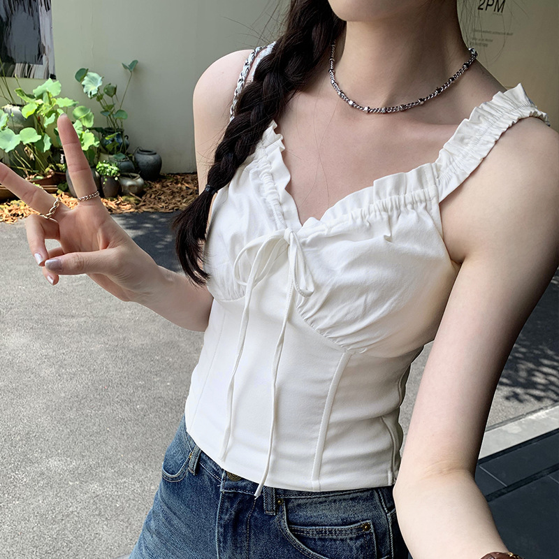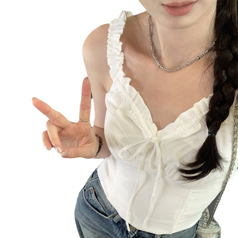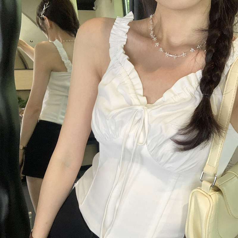 泰式纯欲海边设计感抽褶系带白色无袖背心女夏外穿绝美超好看上衣