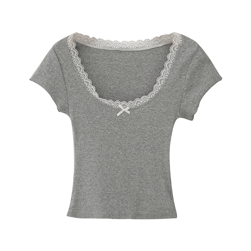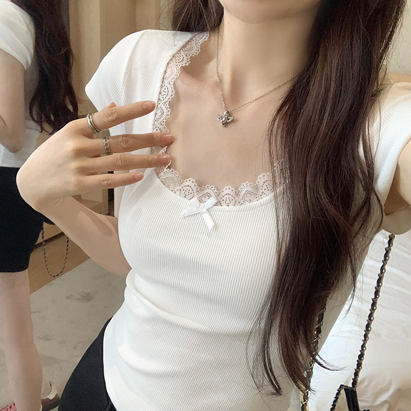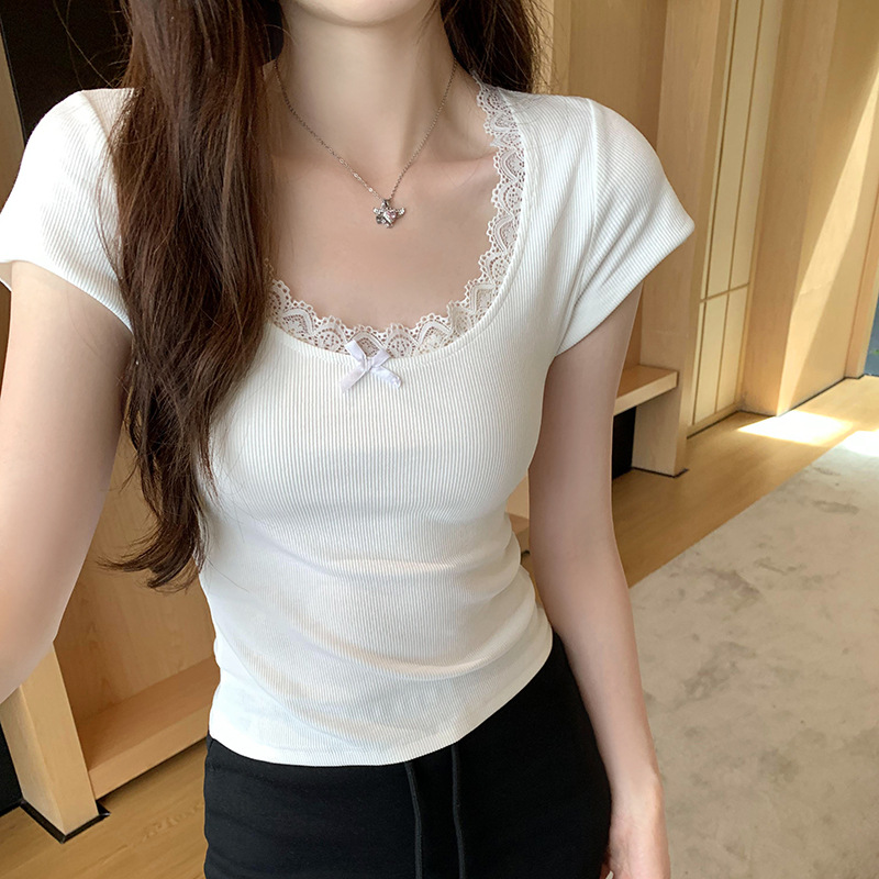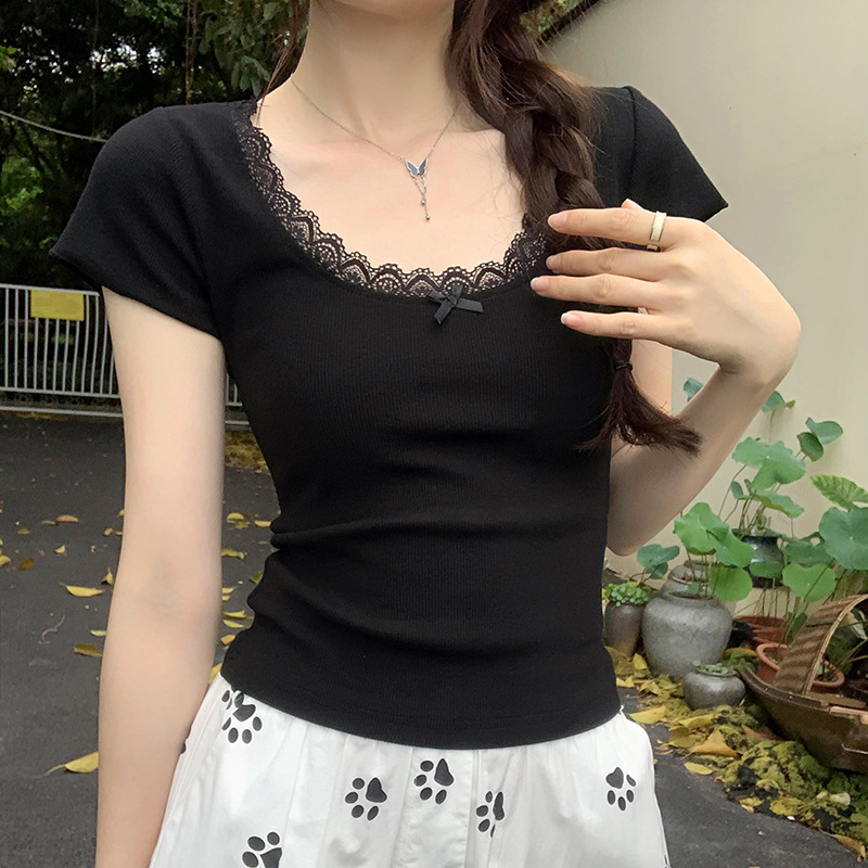 纯欲甜辣漂亮蕾丝花边拼接正肩低圆领短袖T恤女夏新款短上衣