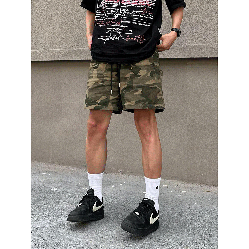 美式复古迷彩工装短裤男夏季新款高街潮牌宽松直筒休闲抽绳五分裤