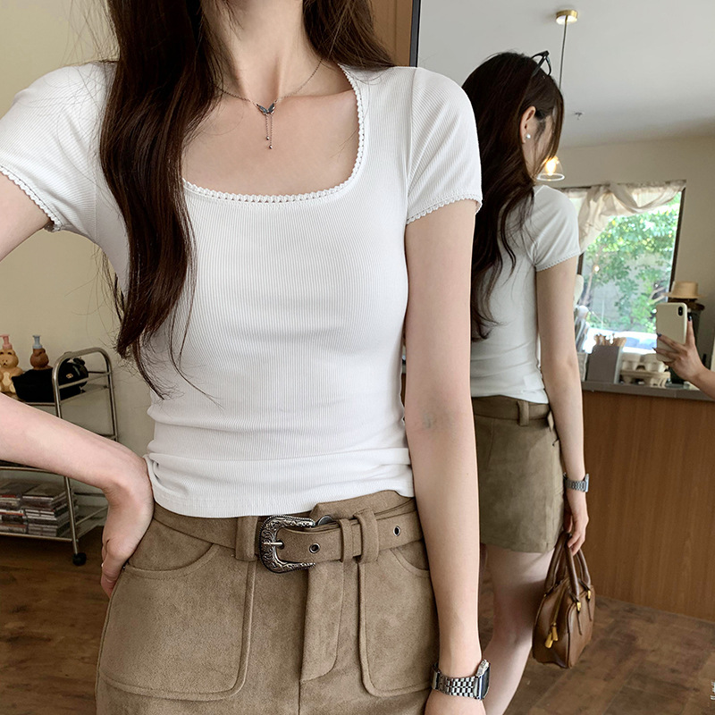 韩系纯欲修身方领小花边螺纹短袖T恤女夏短款别致甜辣很仙的上衣