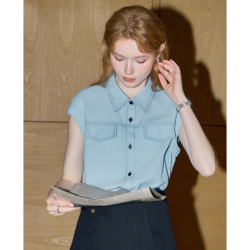 翻领无袖极简衬衫女装2025年夏季新款文艺高智感通勤上衣