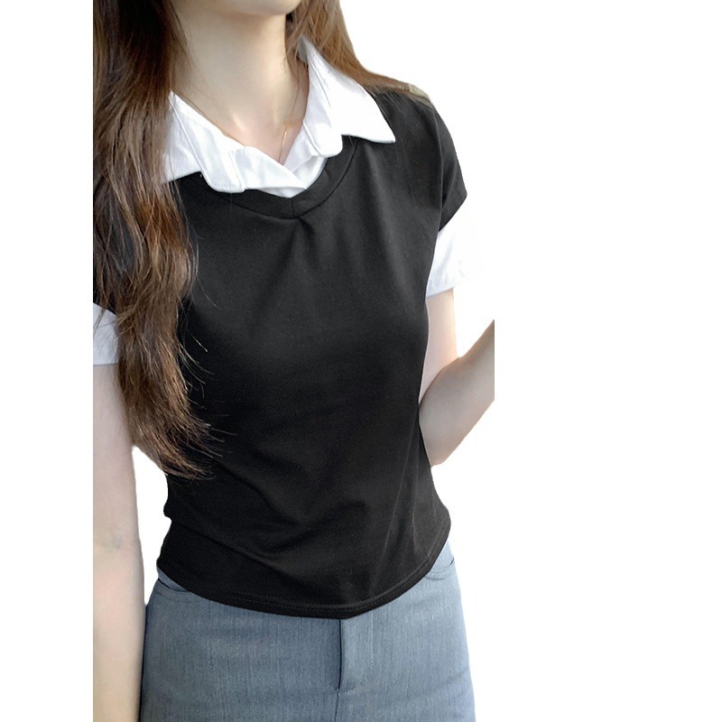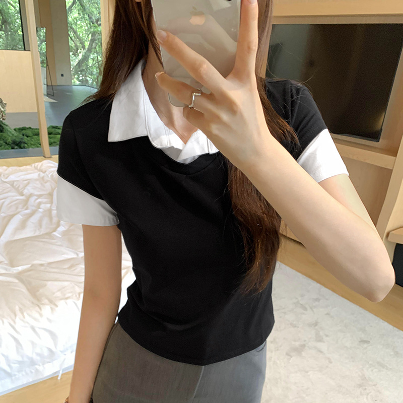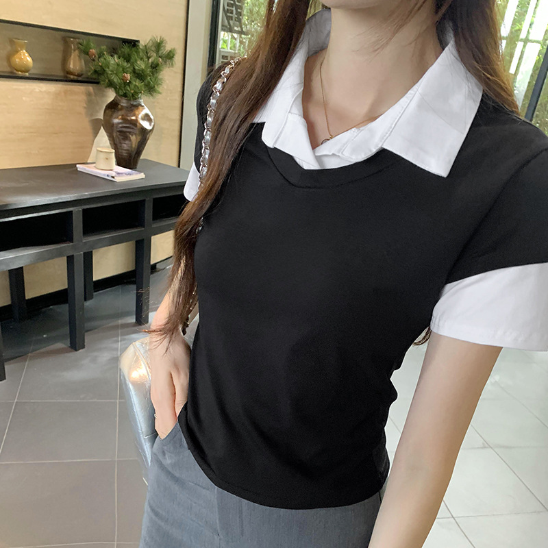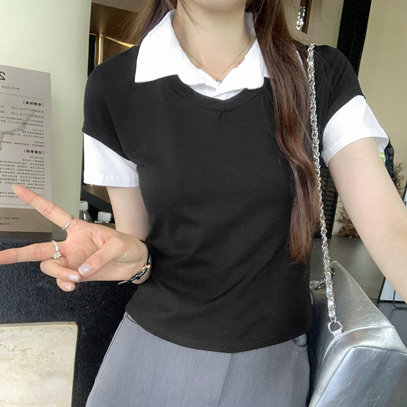 韩系时尚漂亮衬衫式假两件翻领短袖T恤女夏季新款百搭上衣