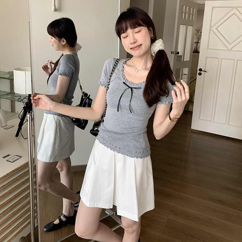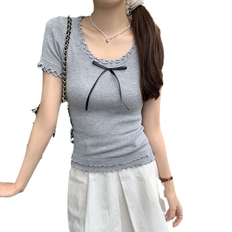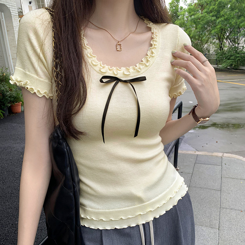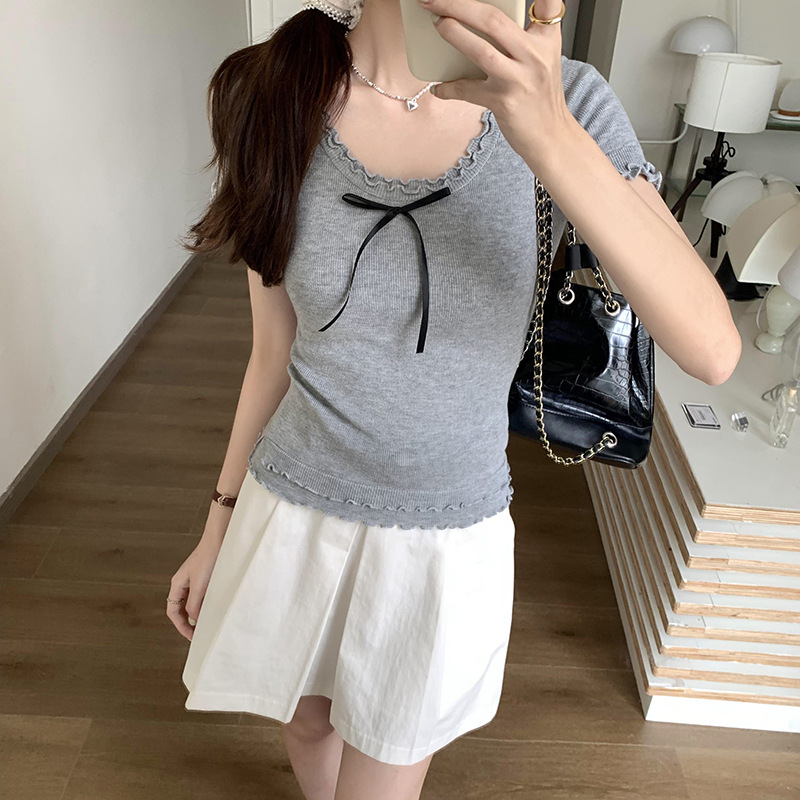 高级感超好看木耳边蝴蝶结薄款短袖针织衫女夏季新款气质减龄上衣