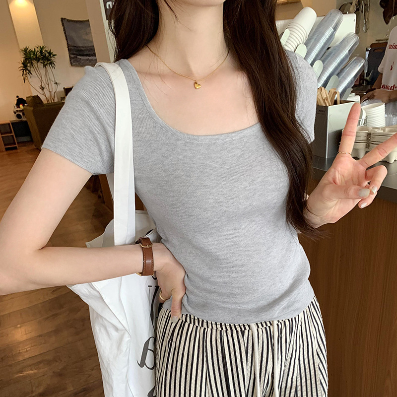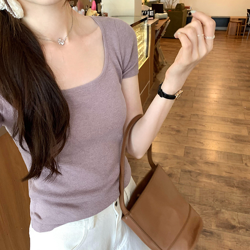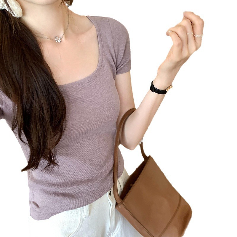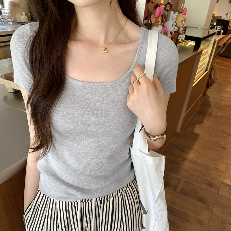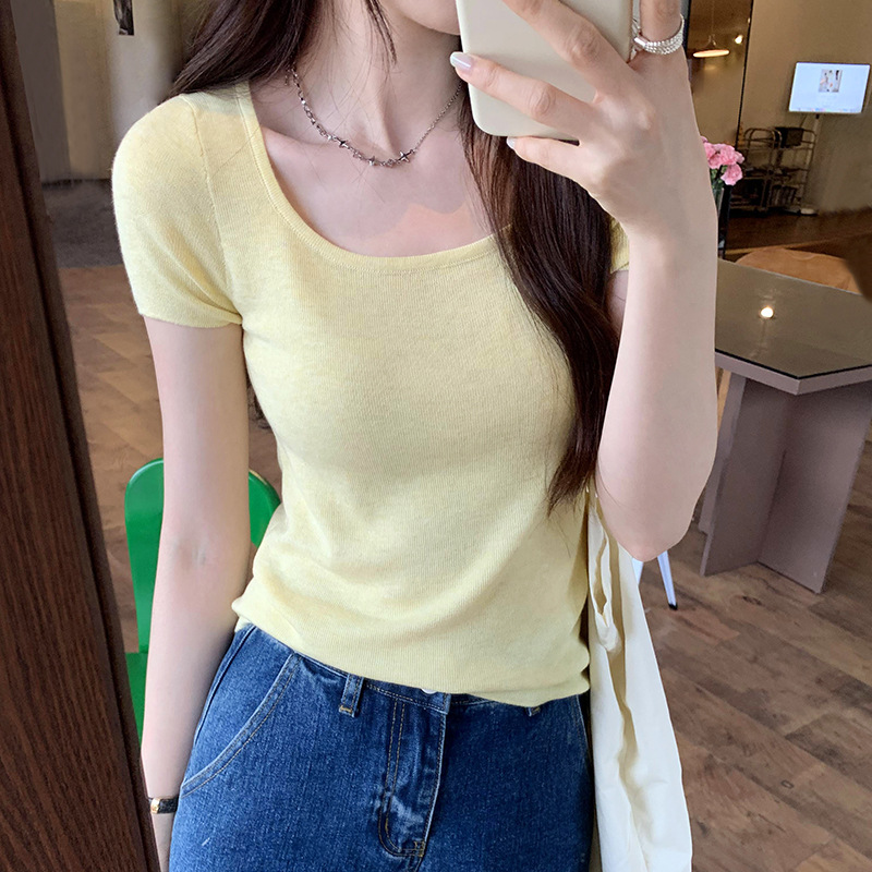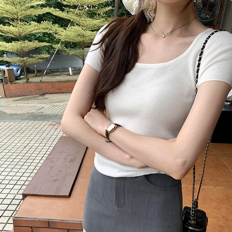 基础款百搭方领短袖针织衫女夏季新款小个子短款正肩气质上衣
