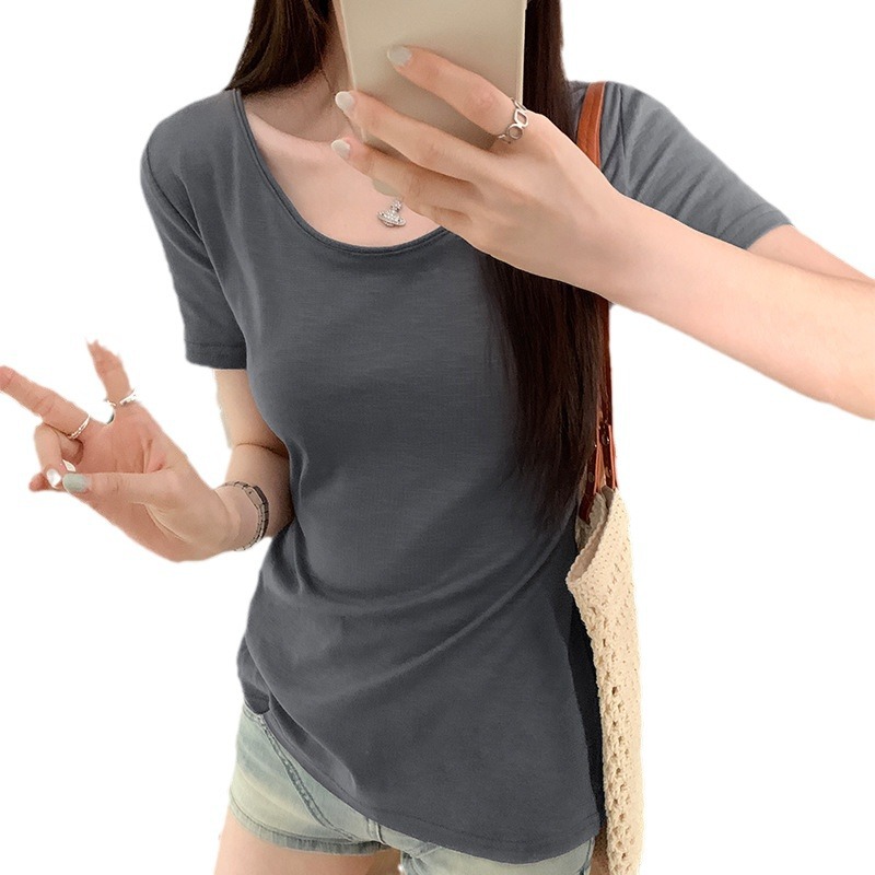 收腰抽褶辣妹t恤女上衣夏季短款小个子正肩显瘦灰色短袖