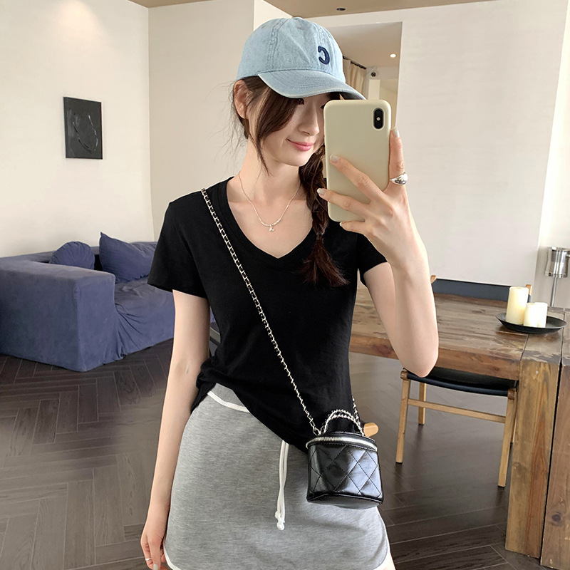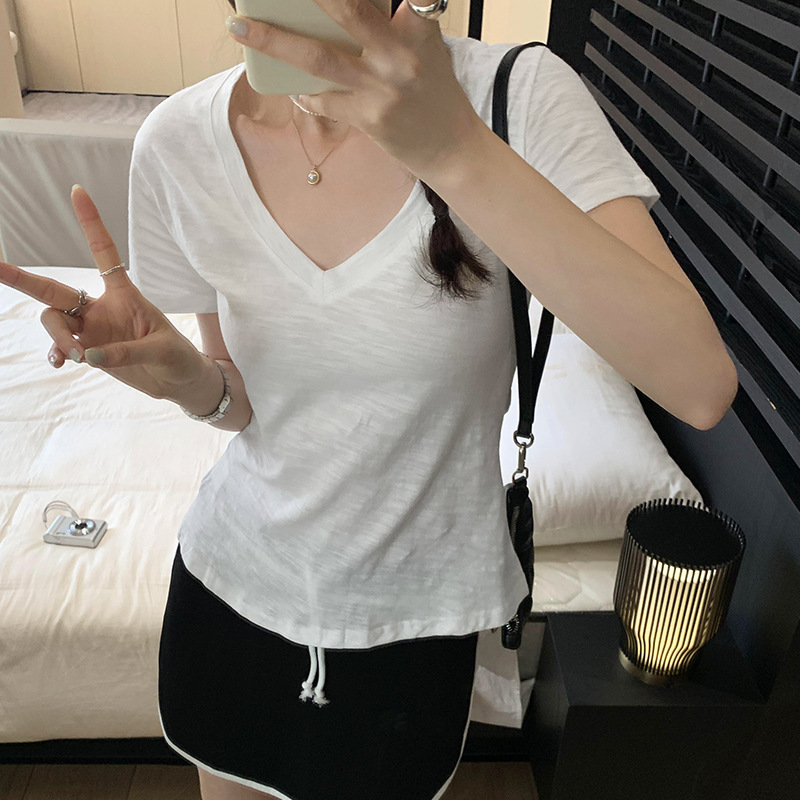 白色V领收腰竹节纯棉正肩短袖T恤女夏季新款爆款纯欲气质上衣