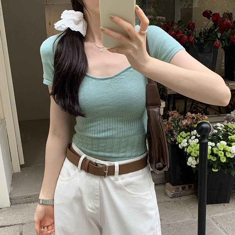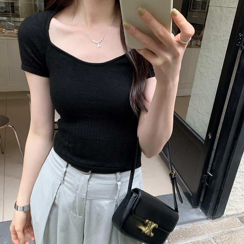 小个子收腰短袖T恤女春夏年新款针织短款修身显瘦百搭V领上衣