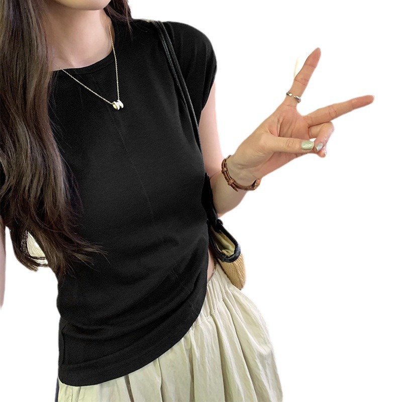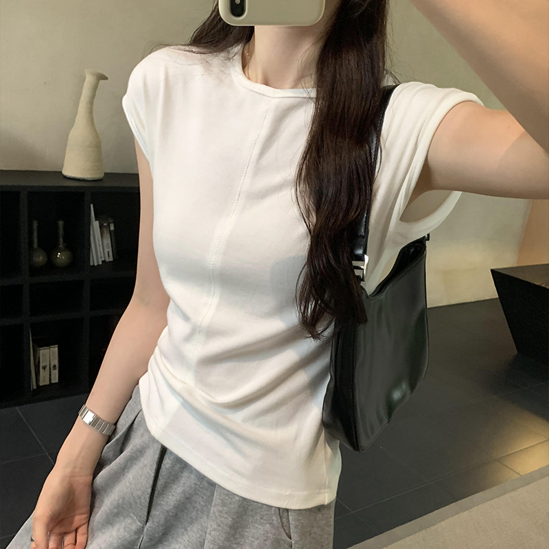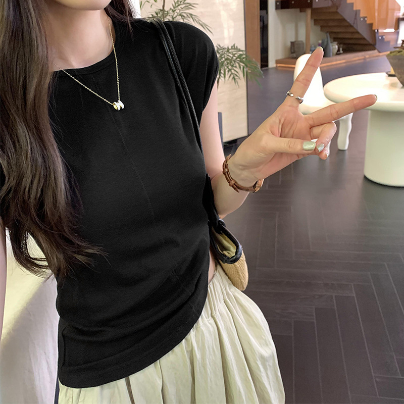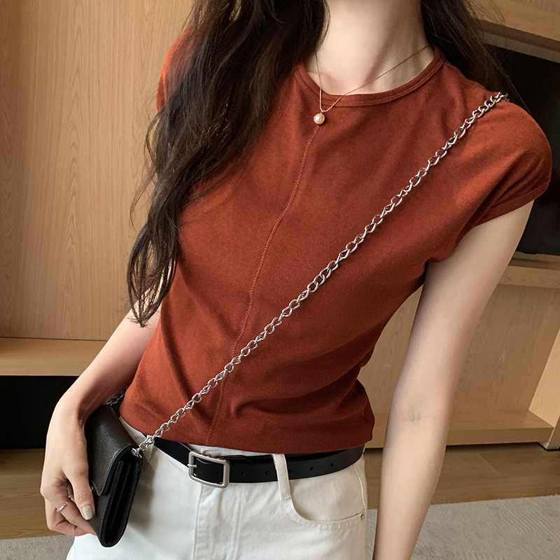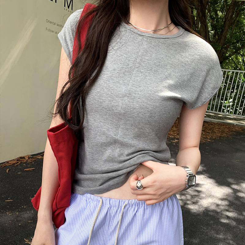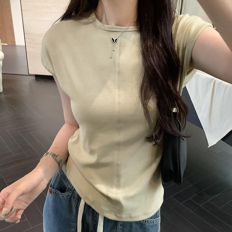 温柔风韩系分割显瘦落肩短袖T恤女夏新款高级感慵懒气质上衣