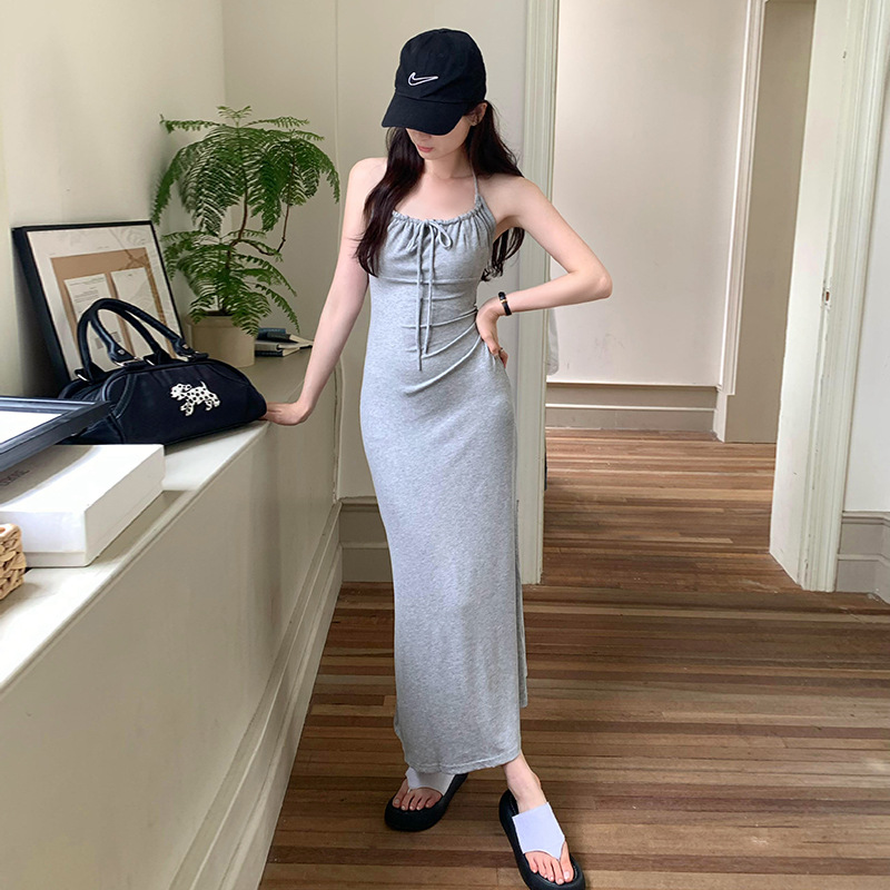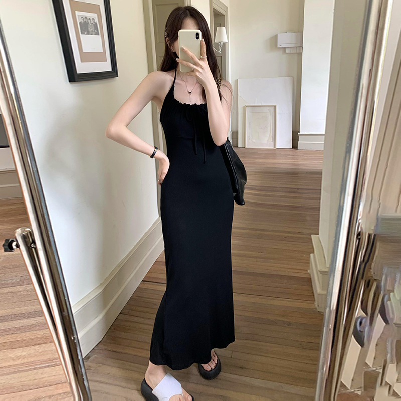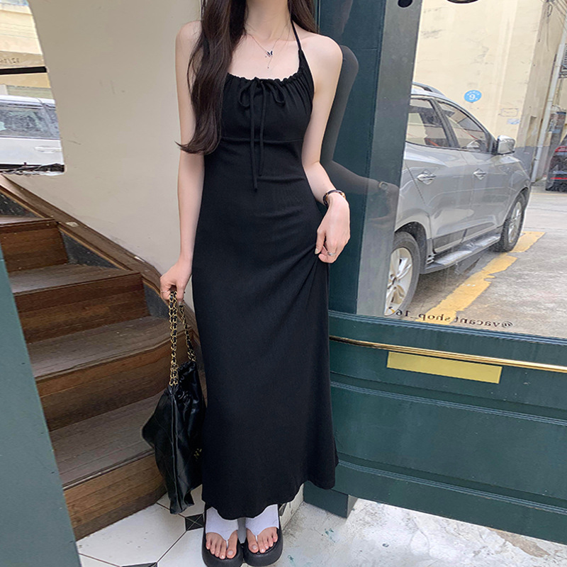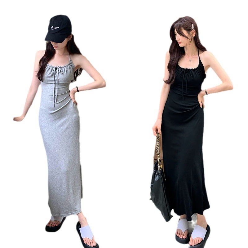 法式漂亮独特螺纹抽绳挂脖系带连衣长裙女夏季御姐风情万种的裙子