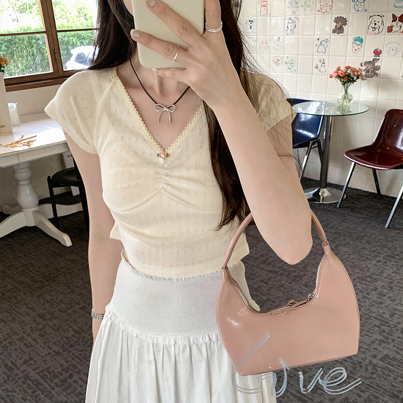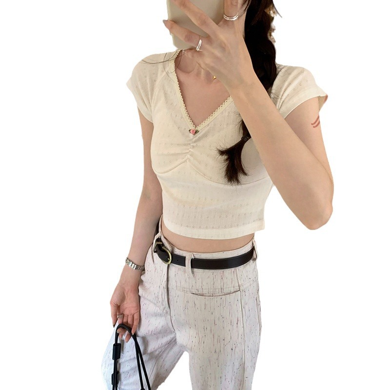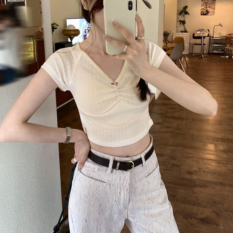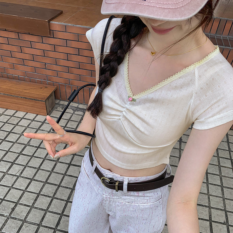 韩系chic别致甜辣小花边V领短袖T恤女夏季绝美独特超好看短上衣