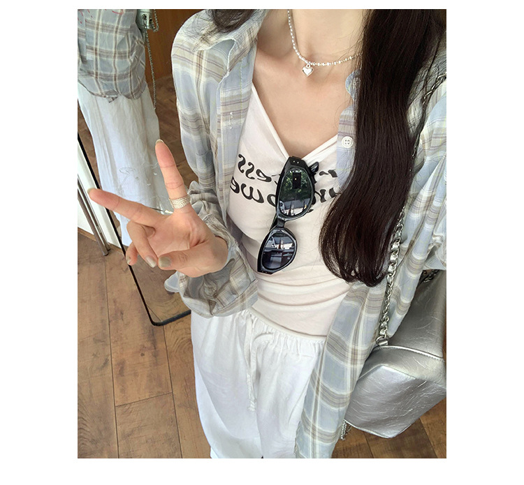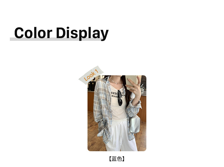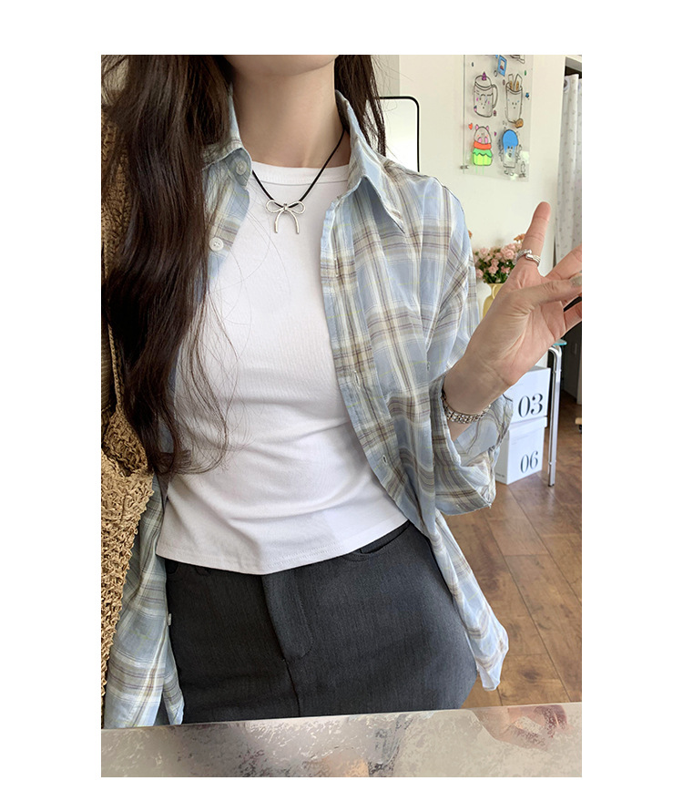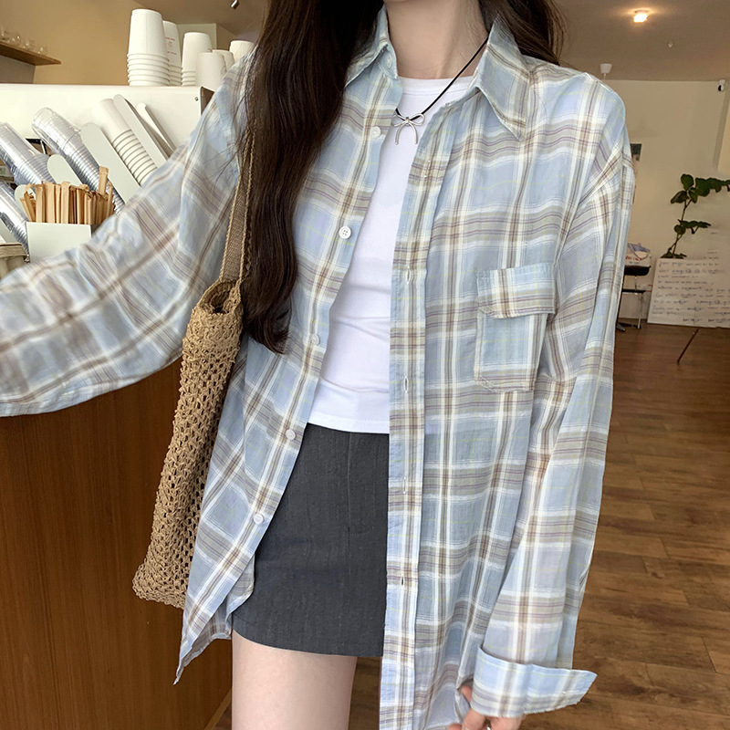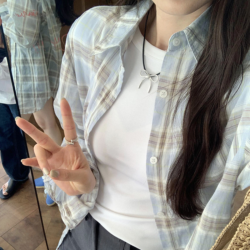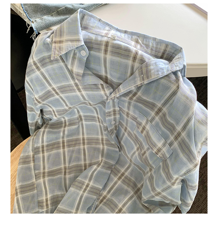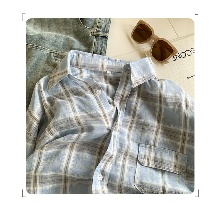 法式气质小香风薄款蓝色纯棉格子衬衫女夏新款小清新宽松通勤上衣