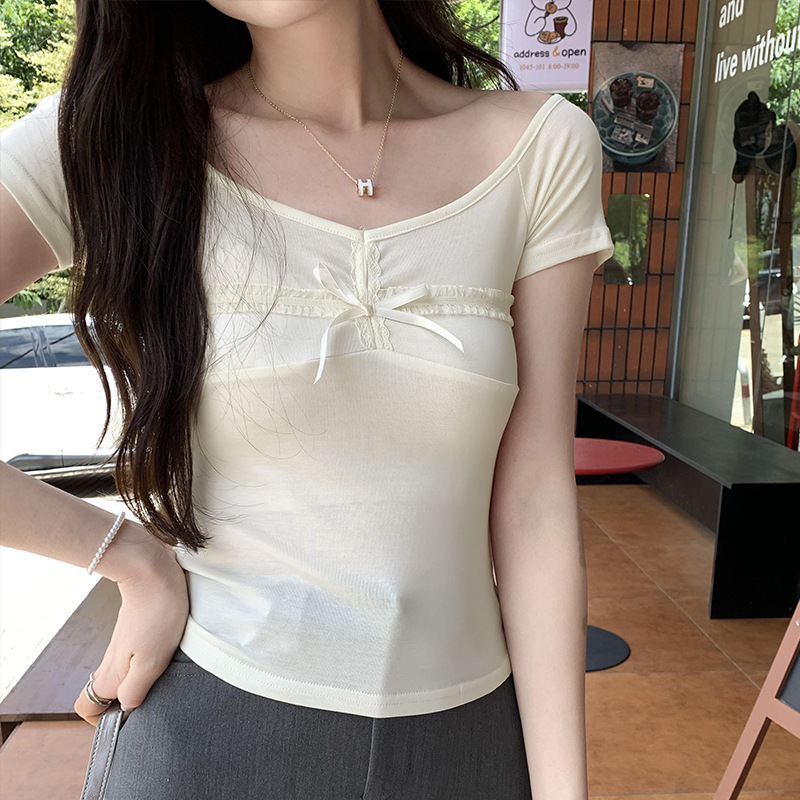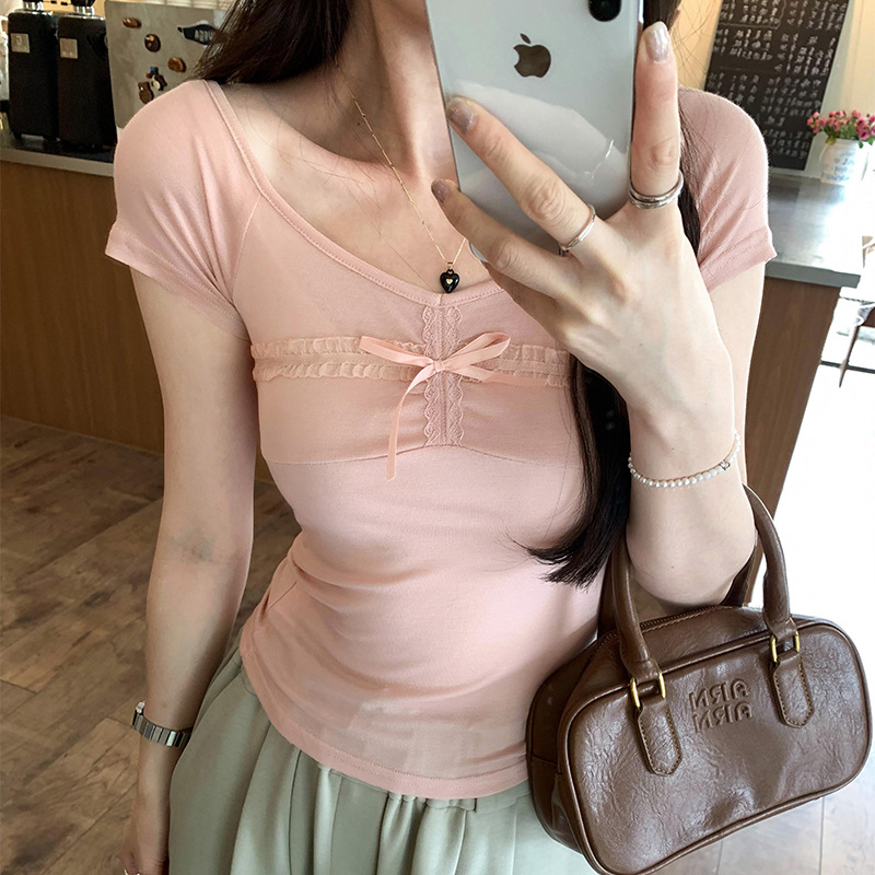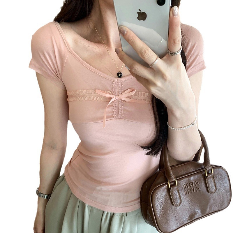 别致设计感大V领蕾丝拼贴分割蝴蝶结短袖T恤女夏新款纯欲韩系上衣