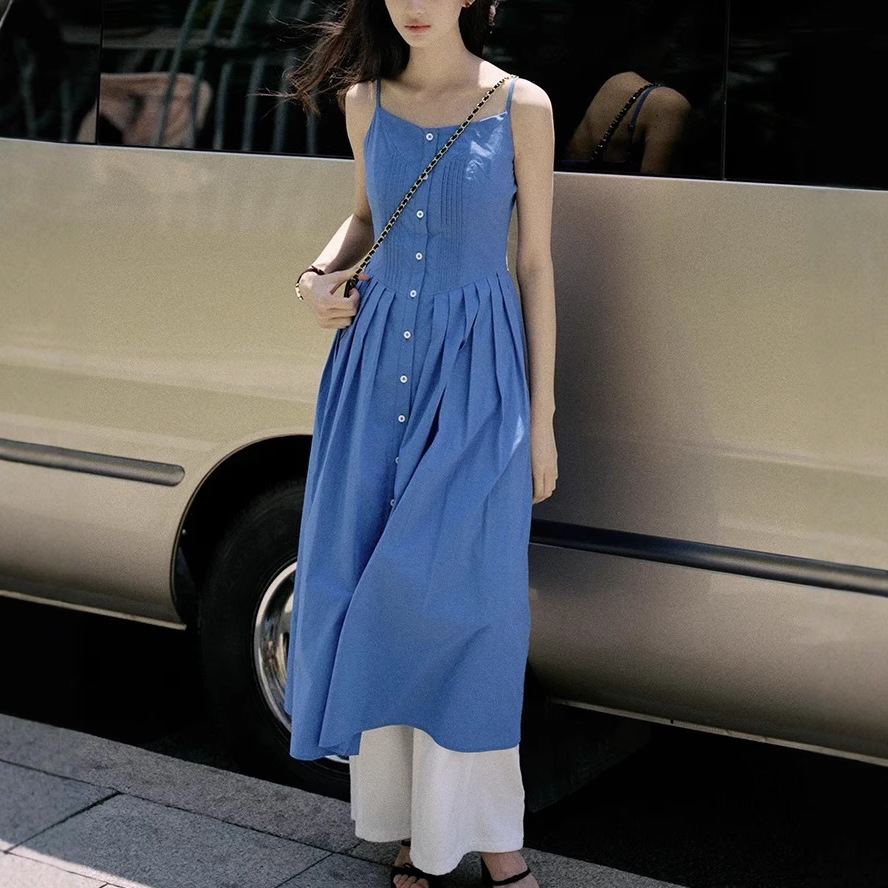克莱因蓝色吊带连衣裙女夏季单排扣显瘦小众设计感裙子