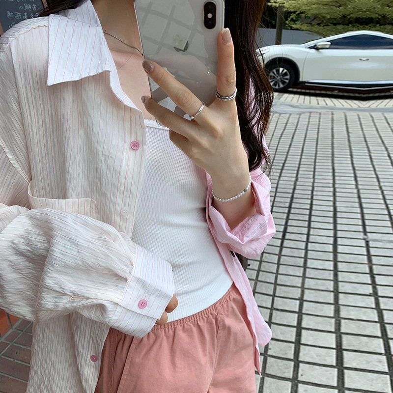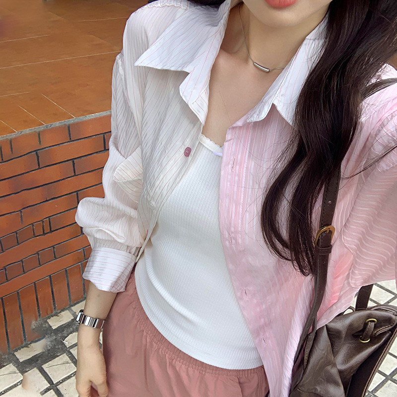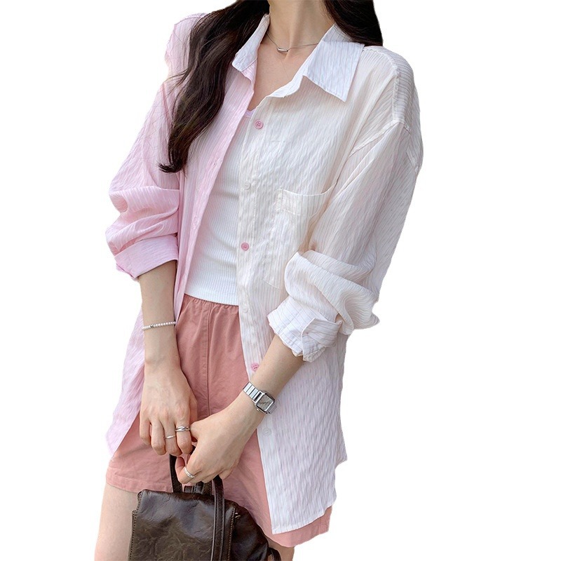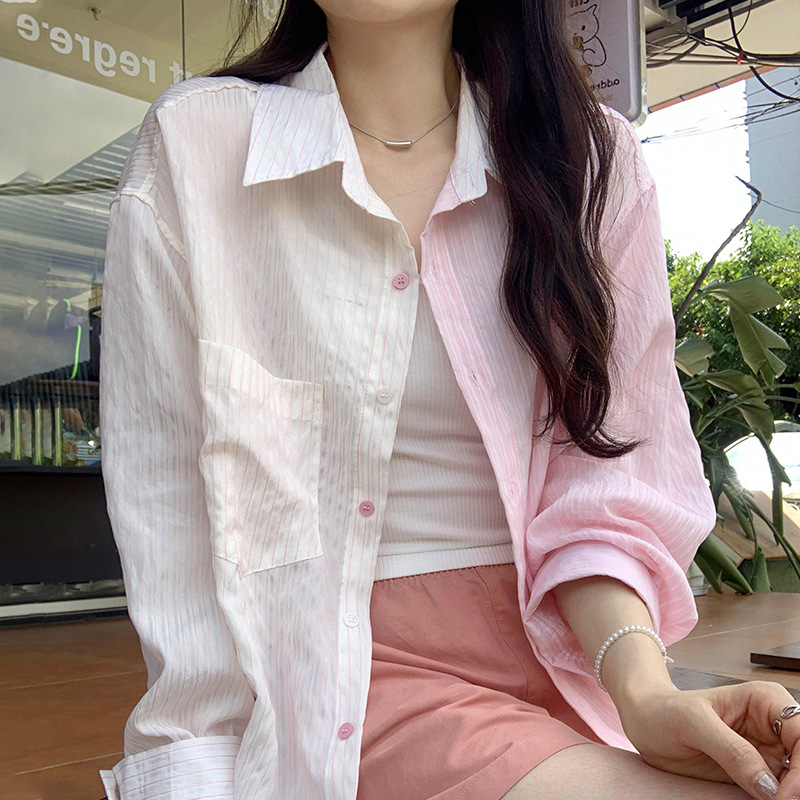 法式独特粉白撞色拼接条纹长袖衬衫女年新款防晒独特漂亮小衫