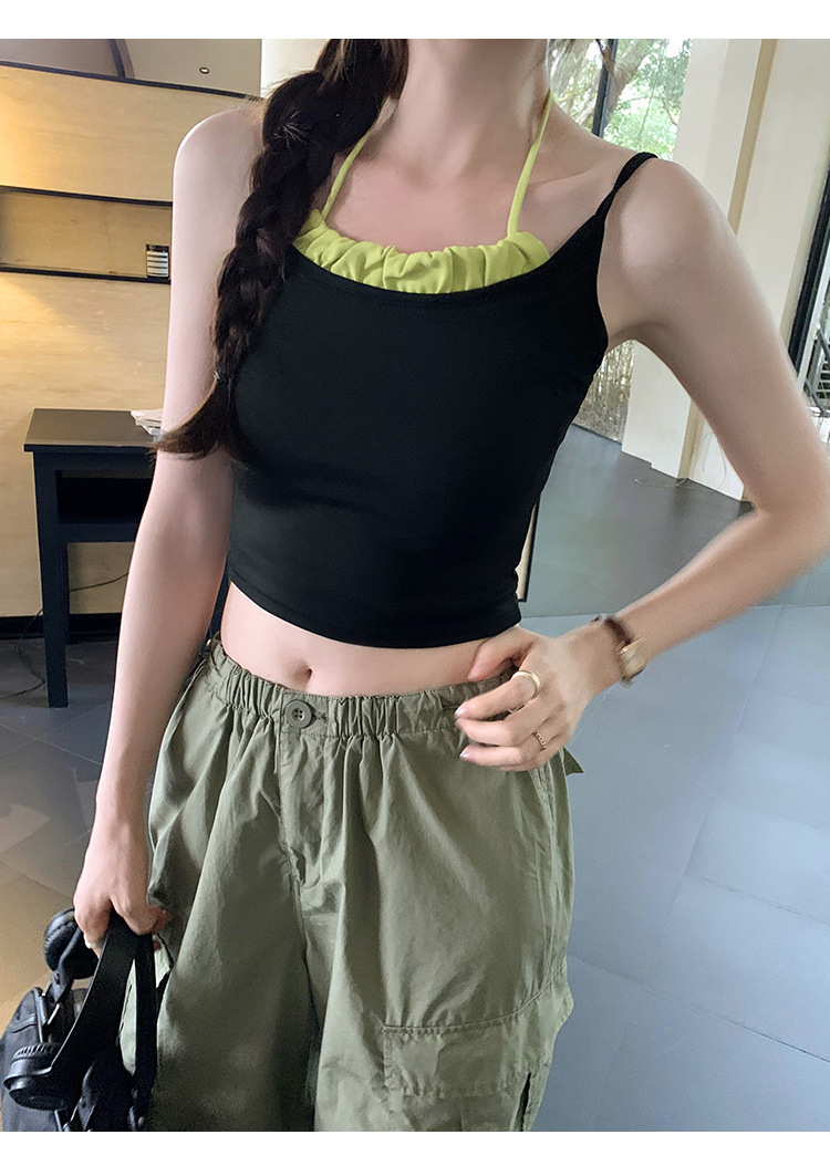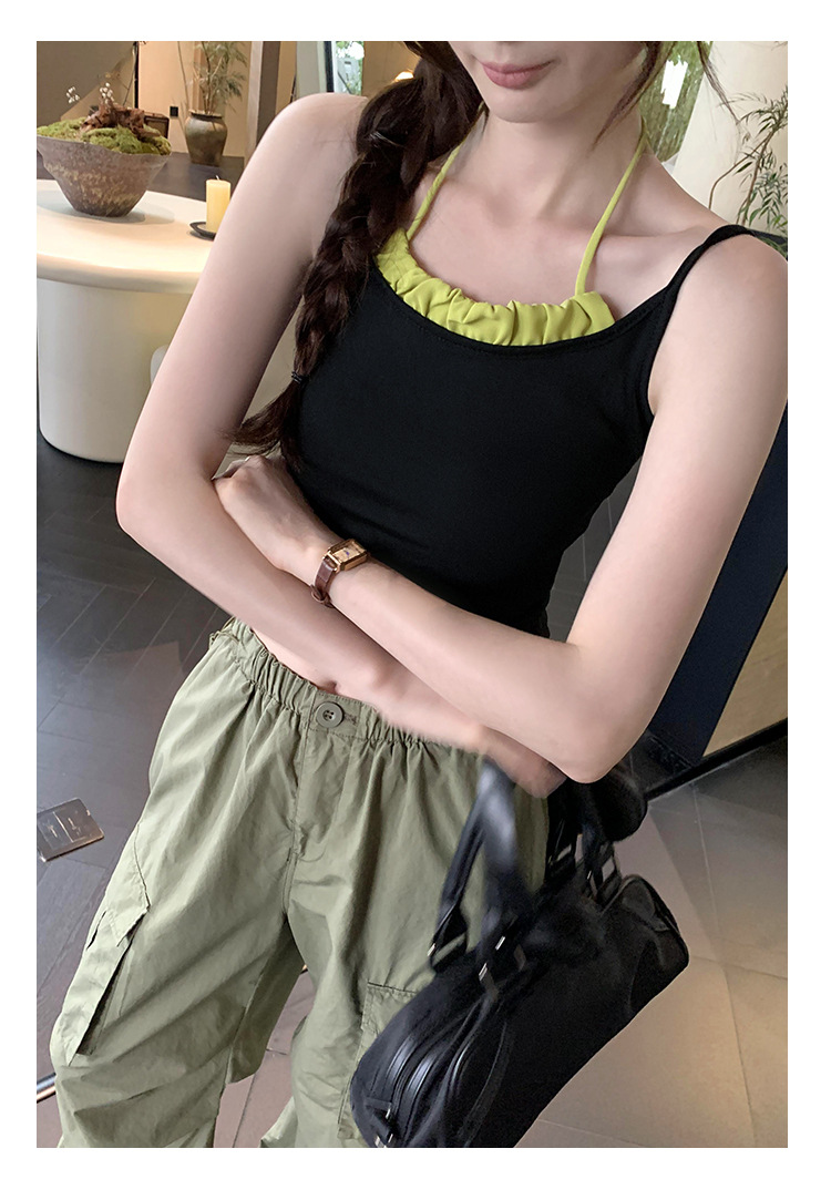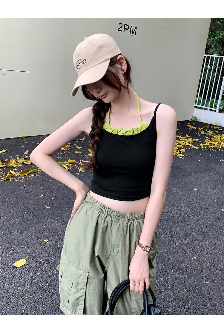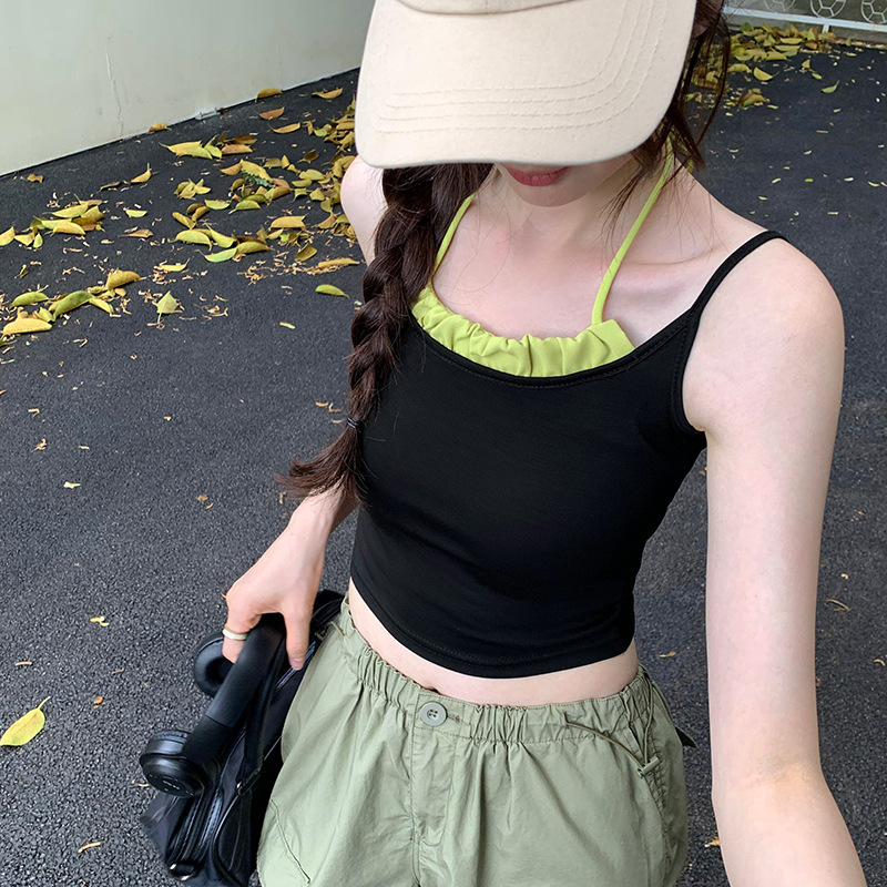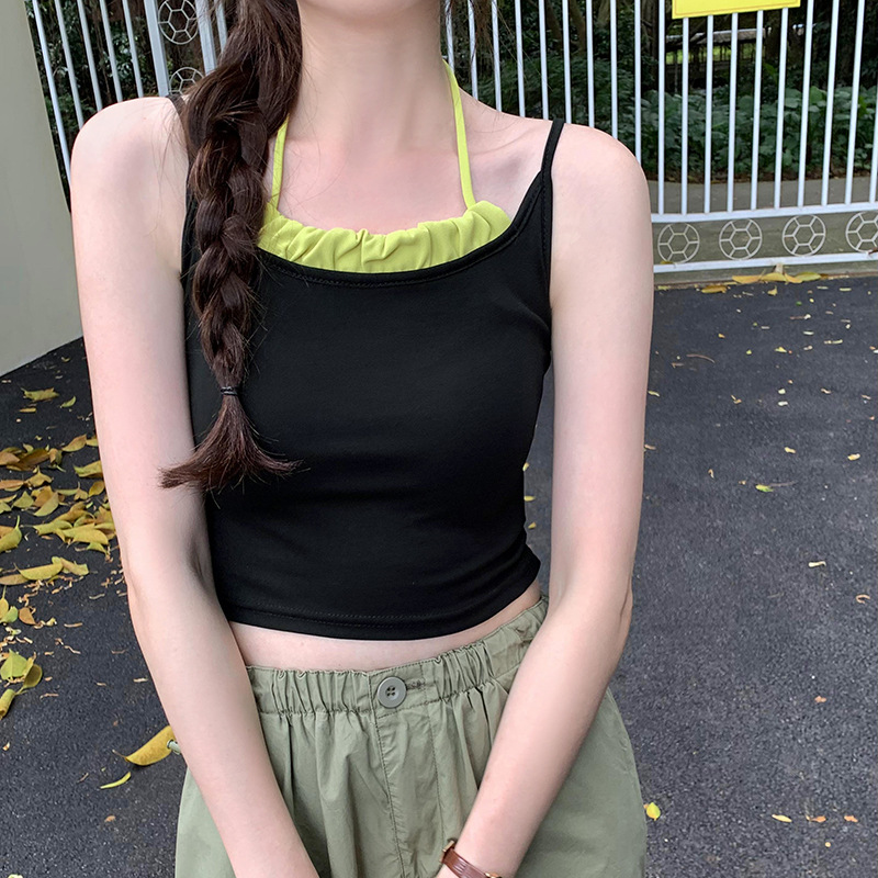 韩系黑色假两件外穿挂脖小吊带女夏季新款绿色系甜辣性感穿搭