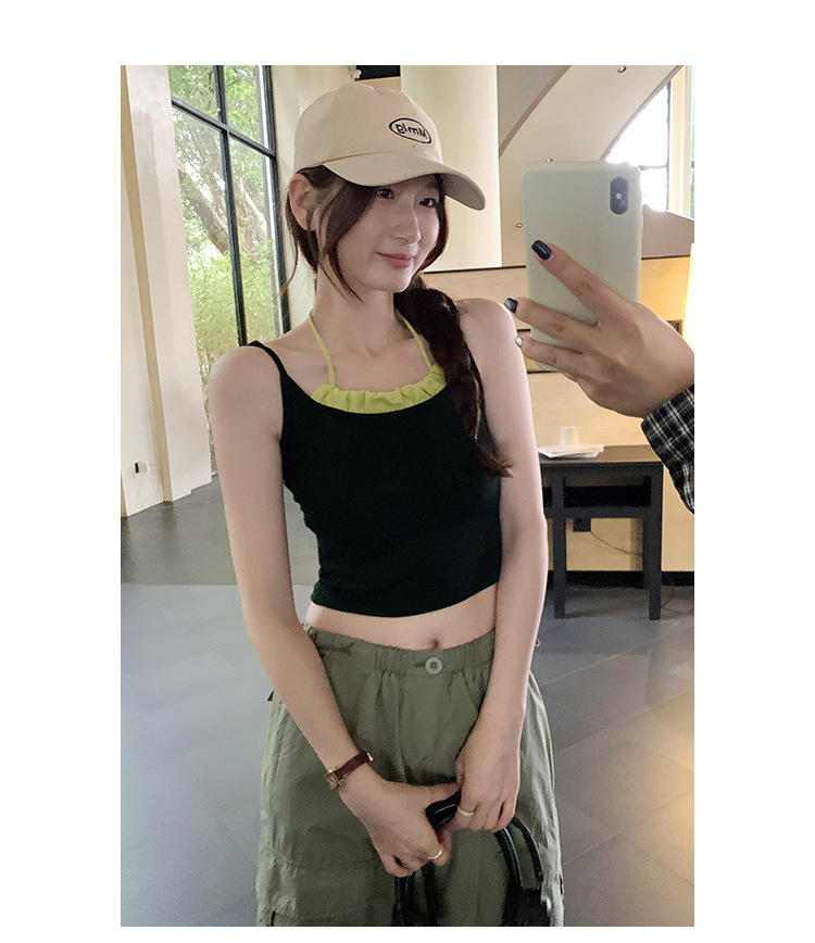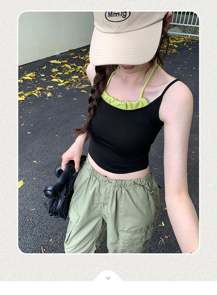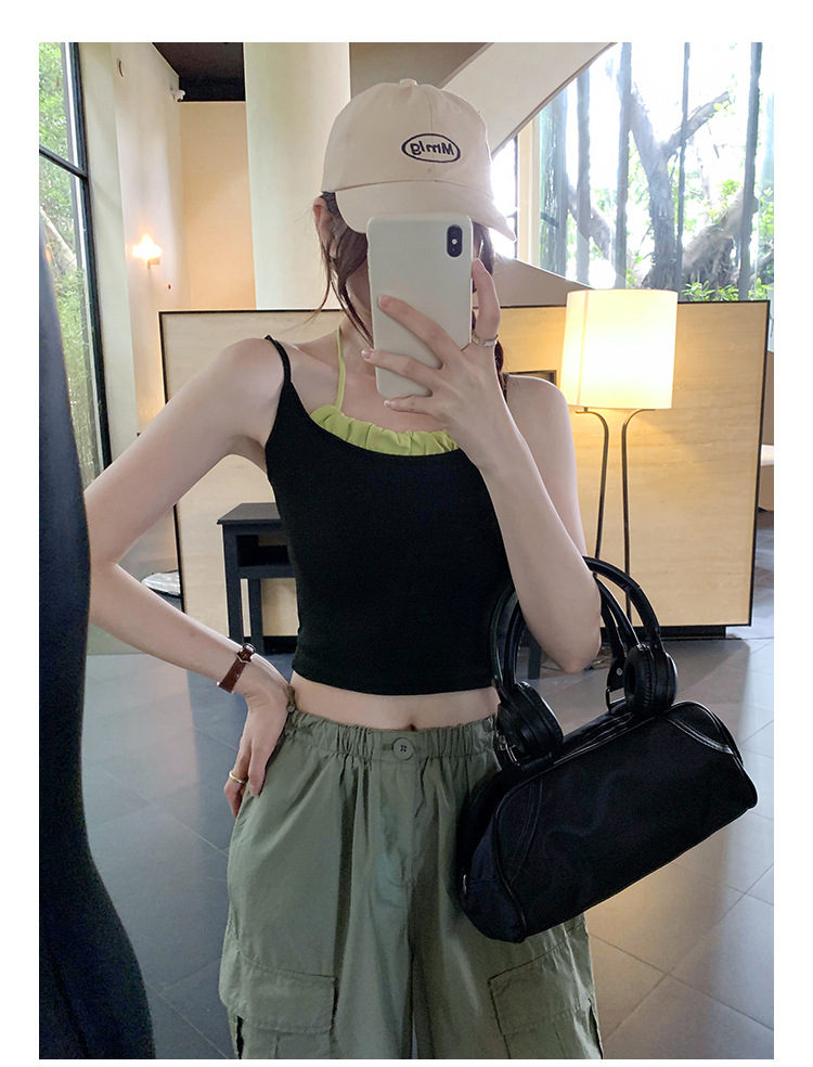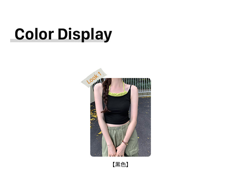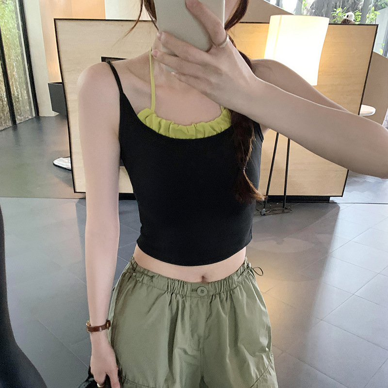 韩系黑色假两件外穿挂脖小吊带女夏季新款绿色系甜辣性感穿搭