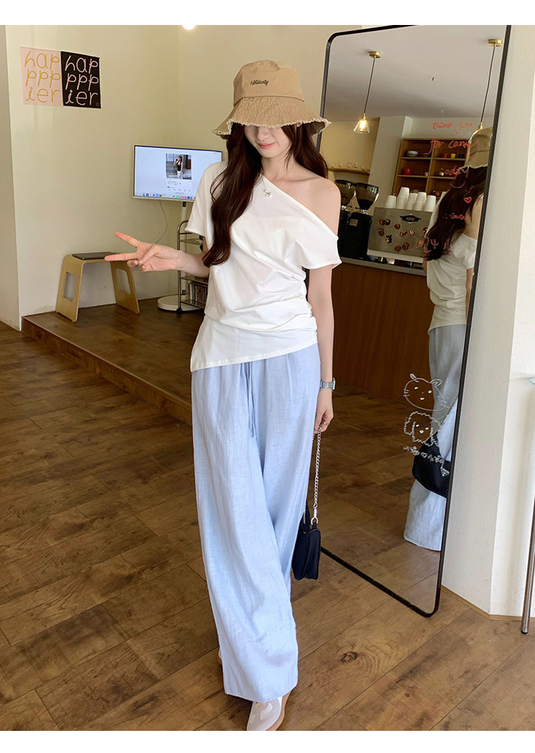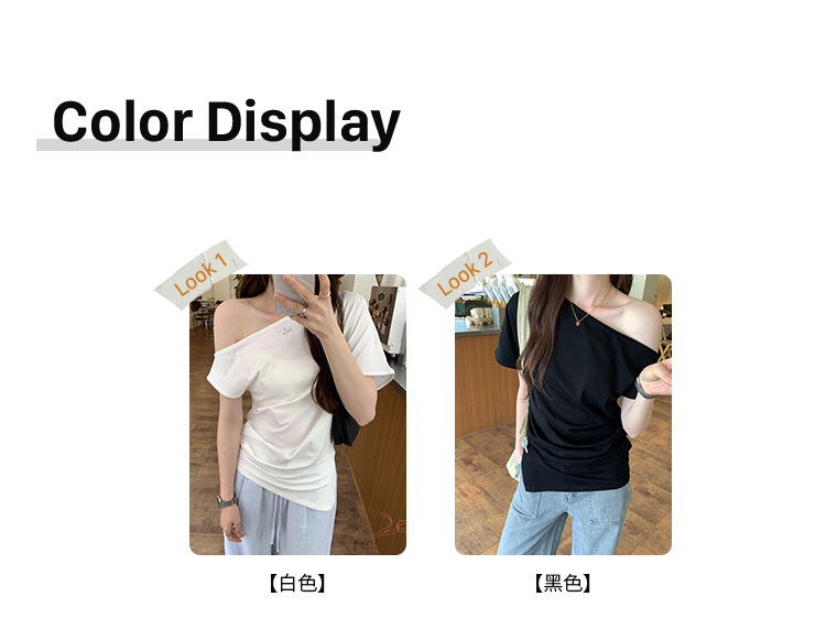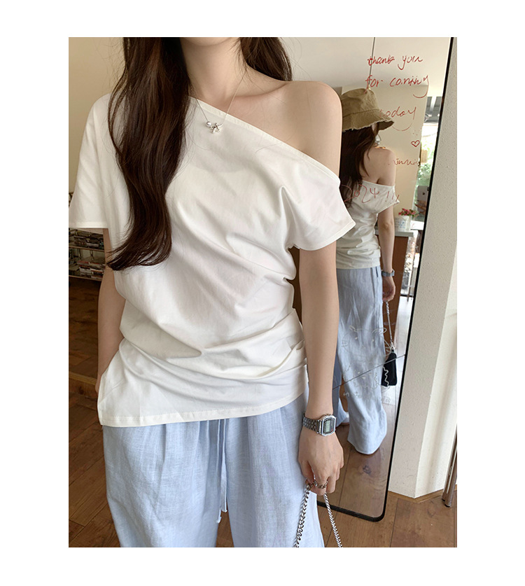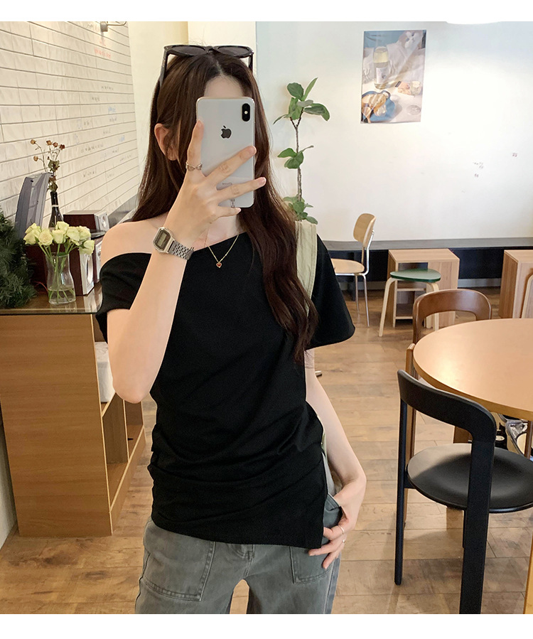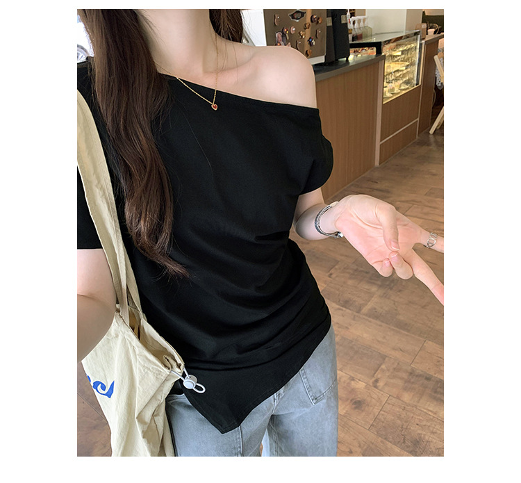 侧缝开叉不规则露肩短袖T恤女夏季新款设计感小众慵懒风绝美上衣