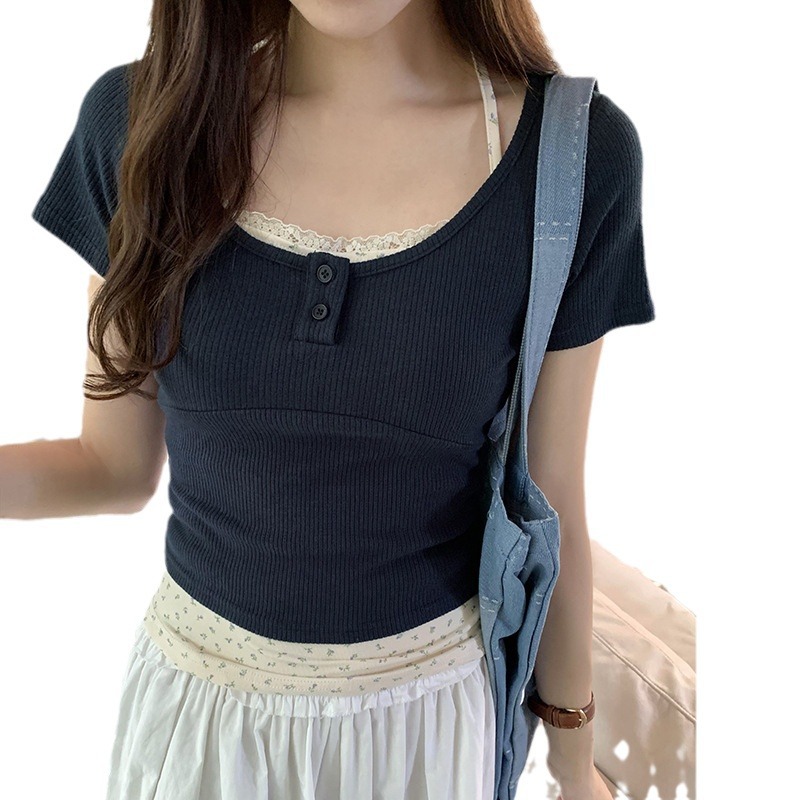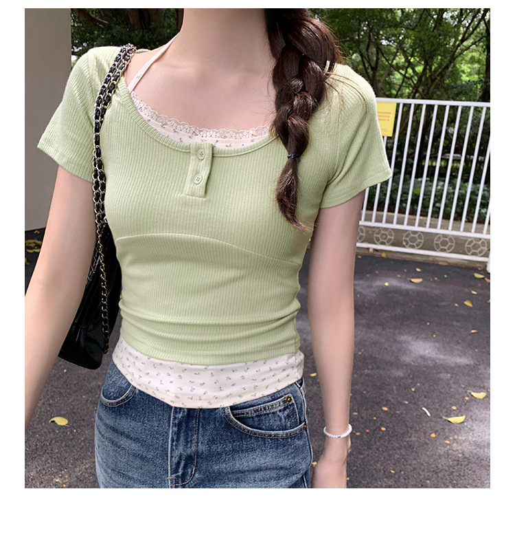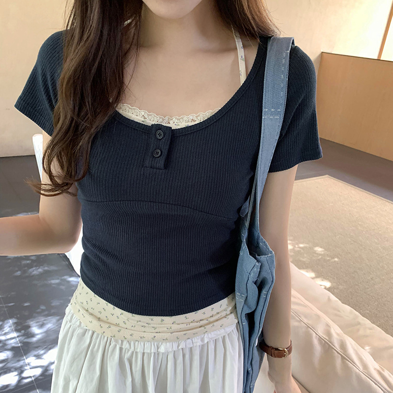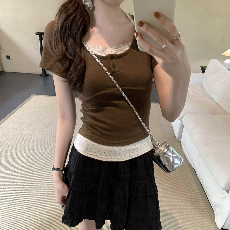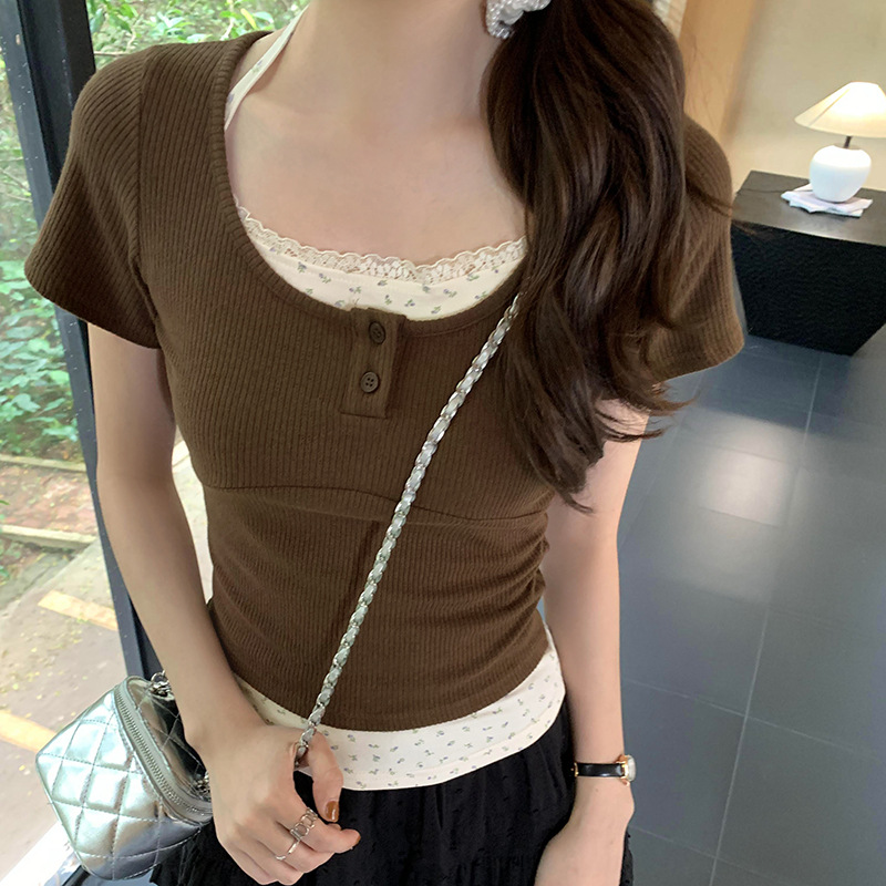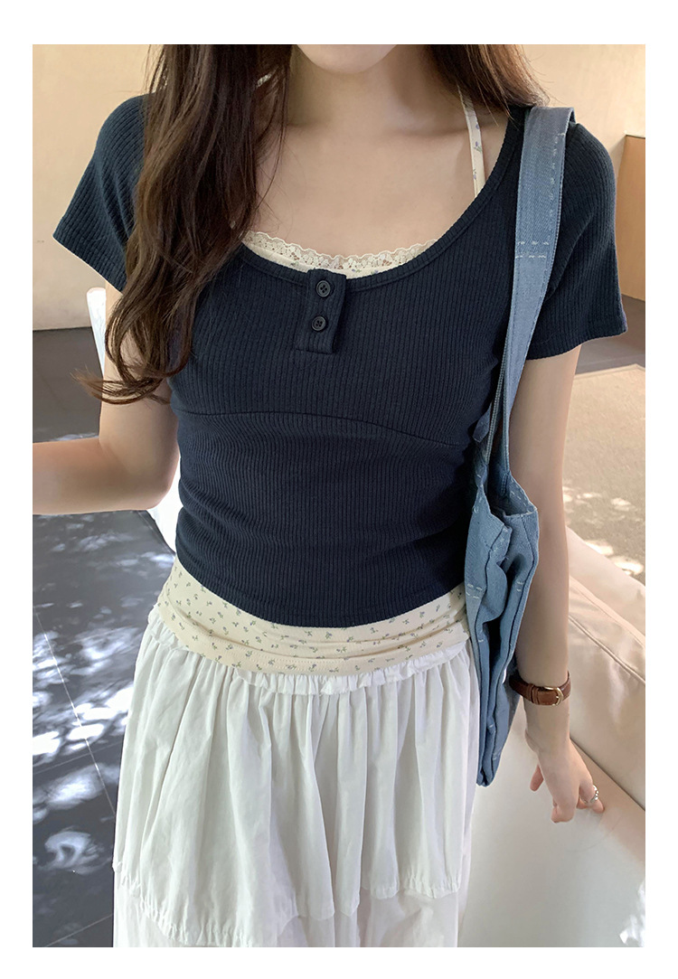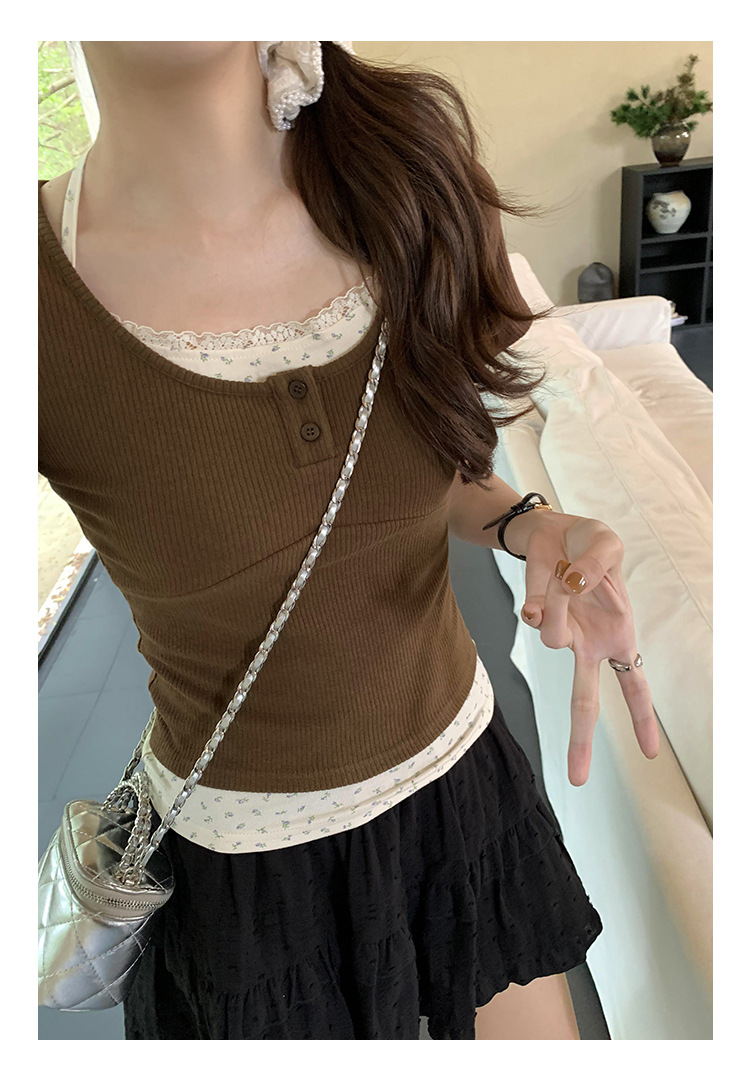 小众独特绝美碎花假两件挂脖系带短袖T恤女夏季新款修身上衣