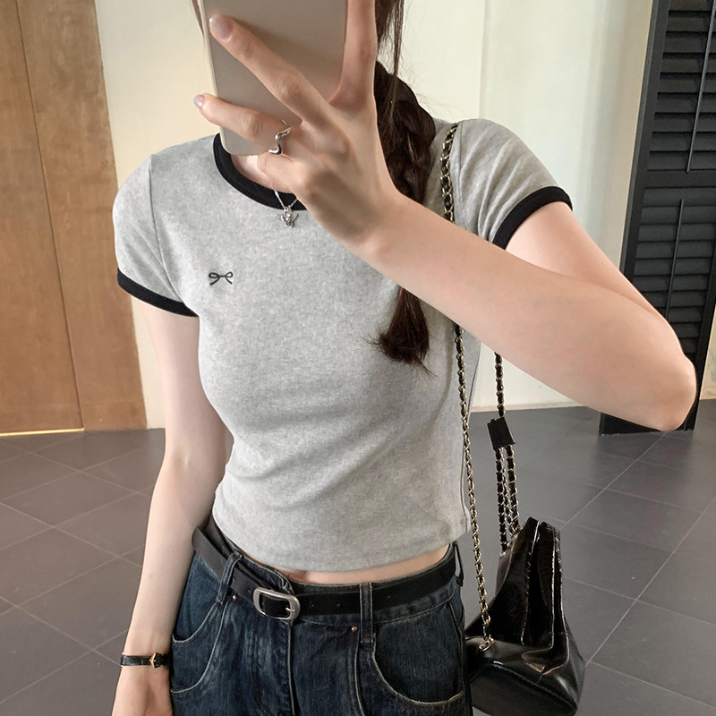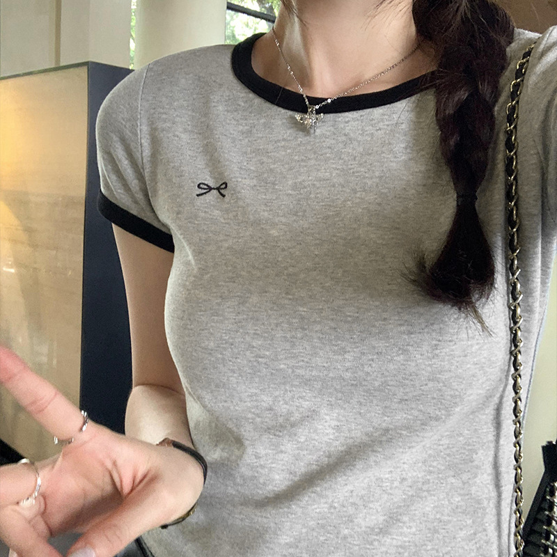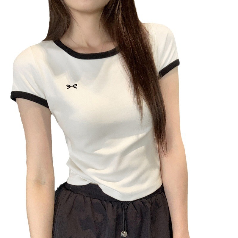 韩系别致蝴蝶结印花撞色短袖T恤女夏季新款爆款正肩显瘦上衣