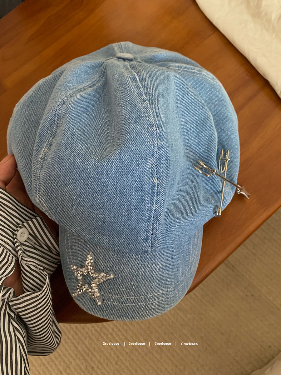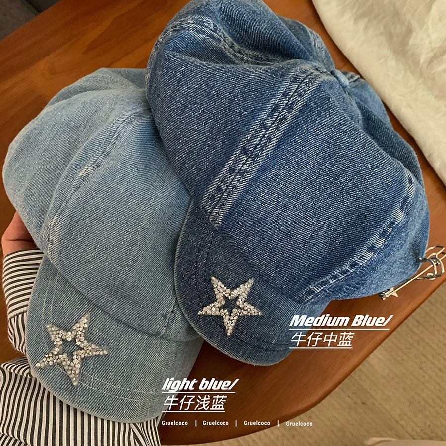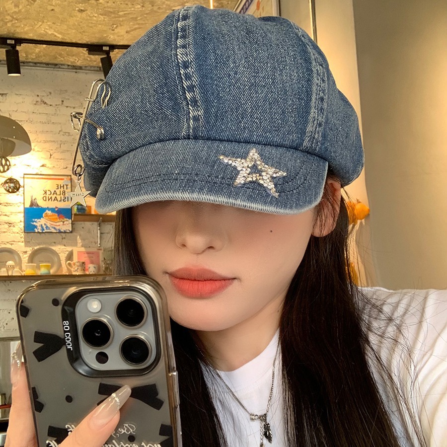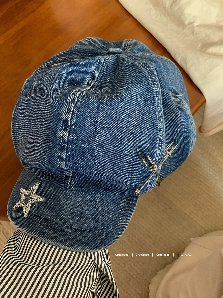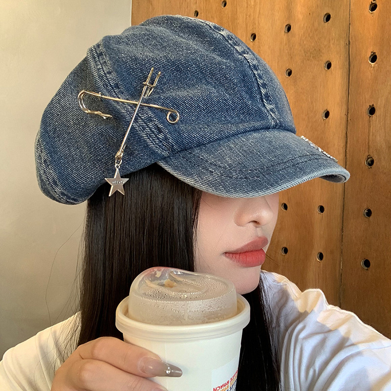 复古星星牛仔贝雷帽女款新款水洗牛仔别针云朵帽别针显脸小女