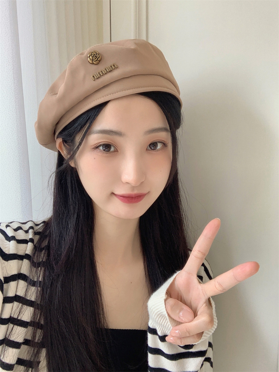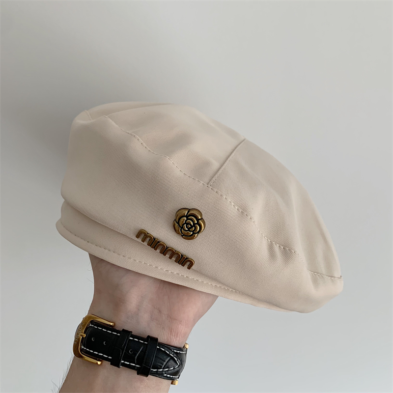 甜酷步调~金属玫瑰花字母贝雷帽女日系甜美百搭复古透气画家帽潮