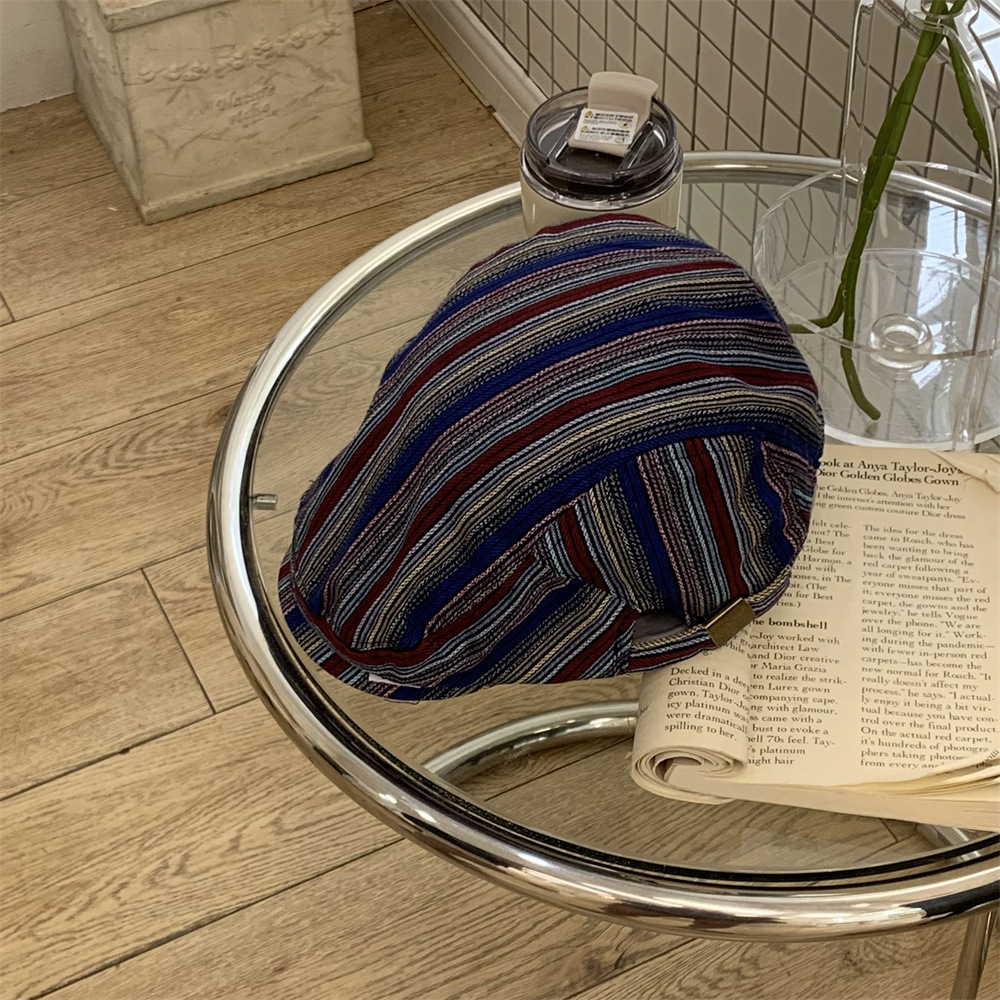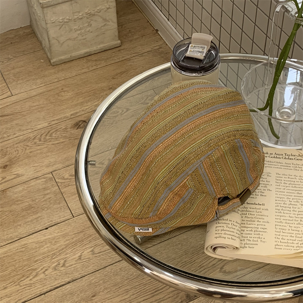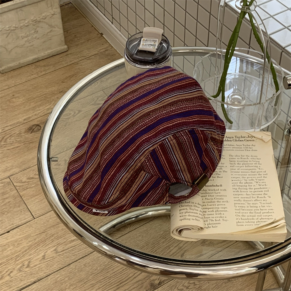 日系复古贝雷帽女百搭条纹格子显脸小报童画家帽大头围反戴前进帽