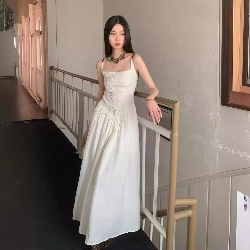 夏季新款新中式刺绣棉质长款露背收腰显瘦吊带度假连衣裙女