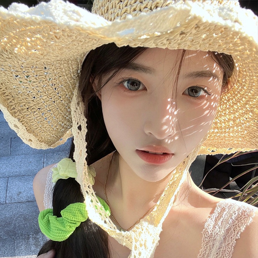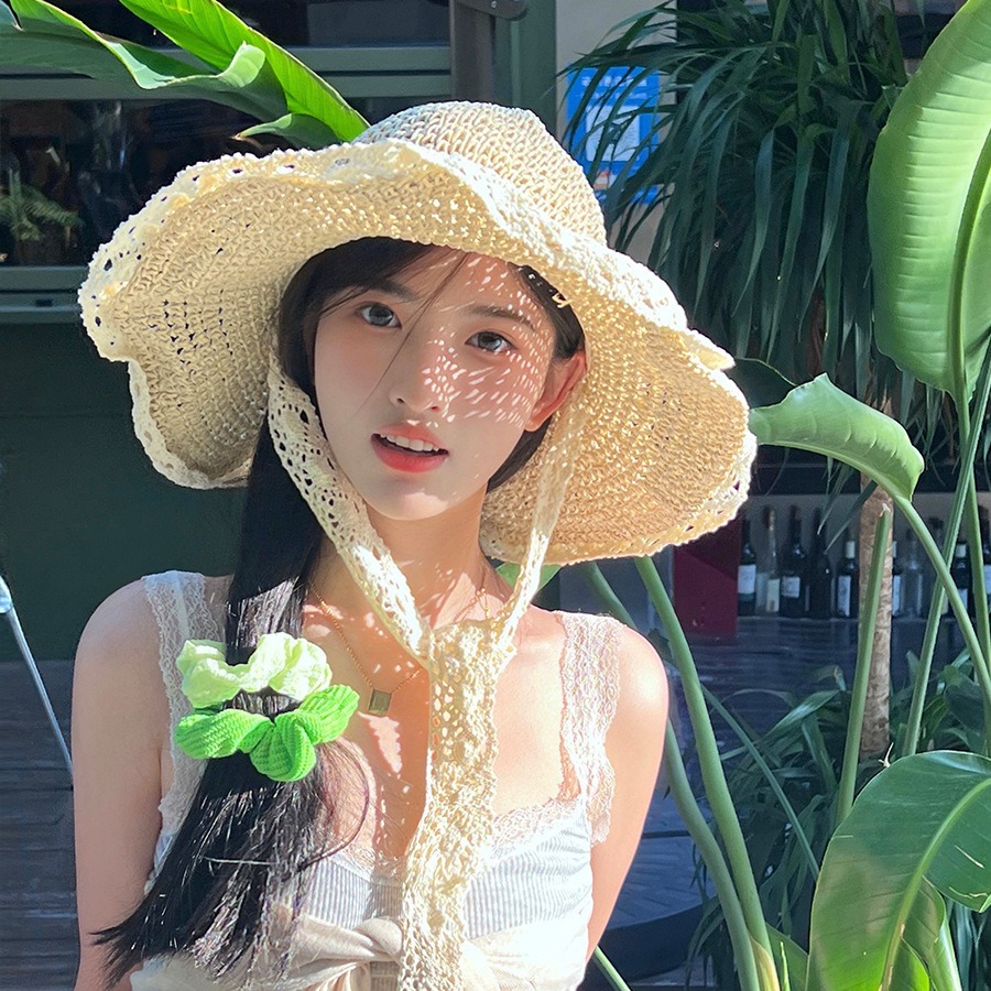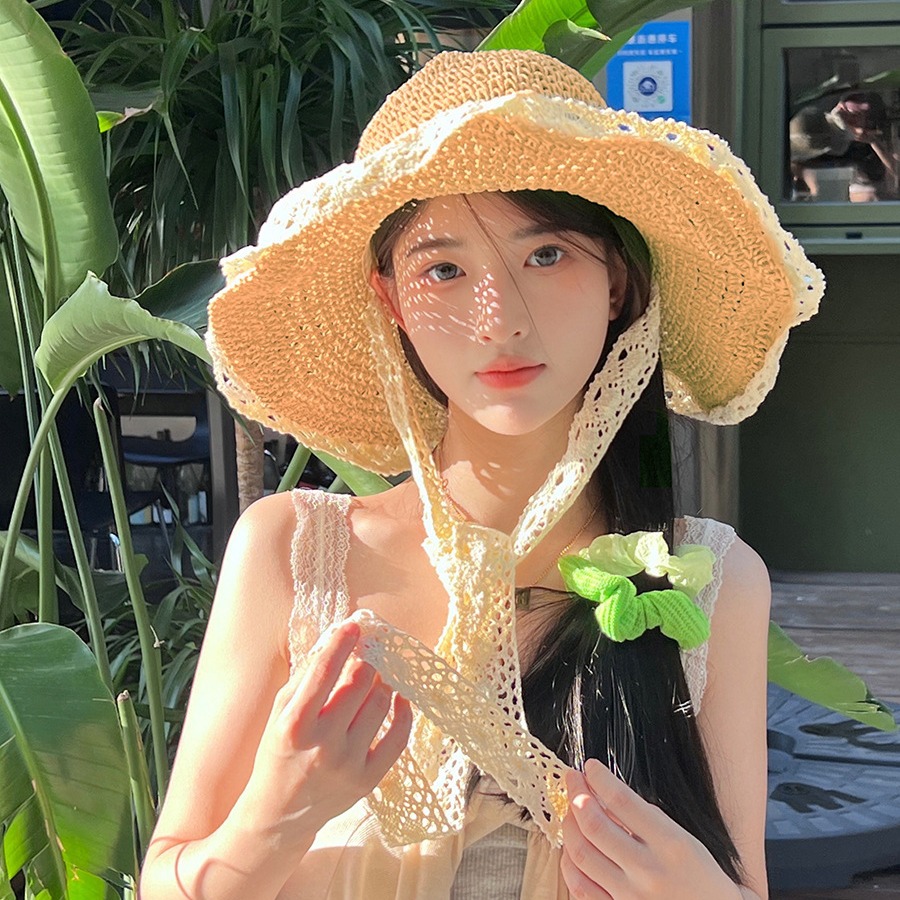 蕾丝花边系带镂空草帽女夏季海边出游沙滩透气防晒大帽檐遮阳帽子