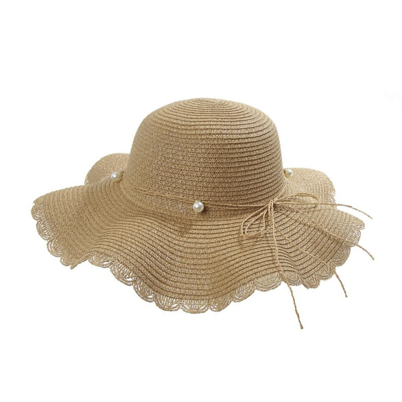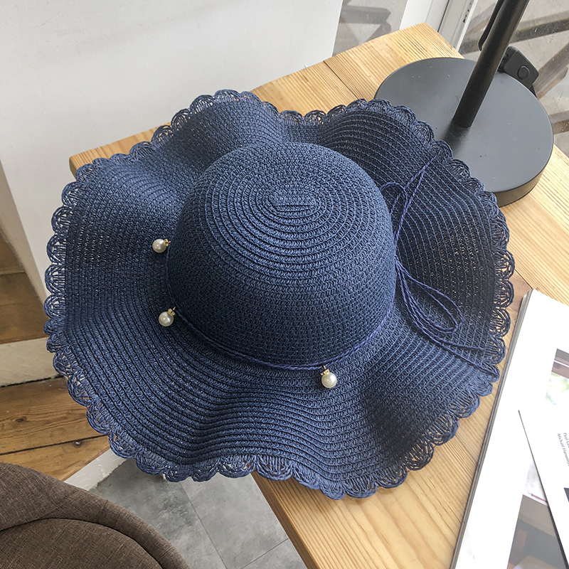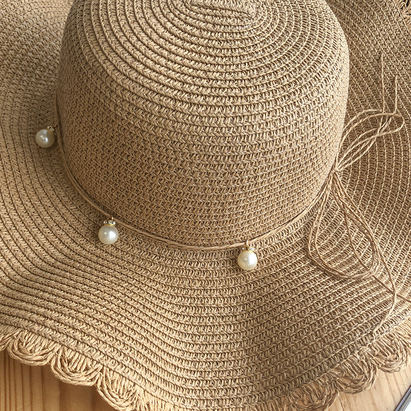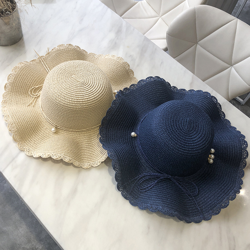 帽子女夏天小清新波浪大沿草帽韩版百搭珍珠休闲防晒沙滩遮阳帽潮