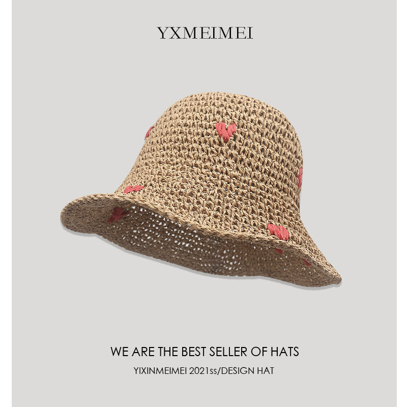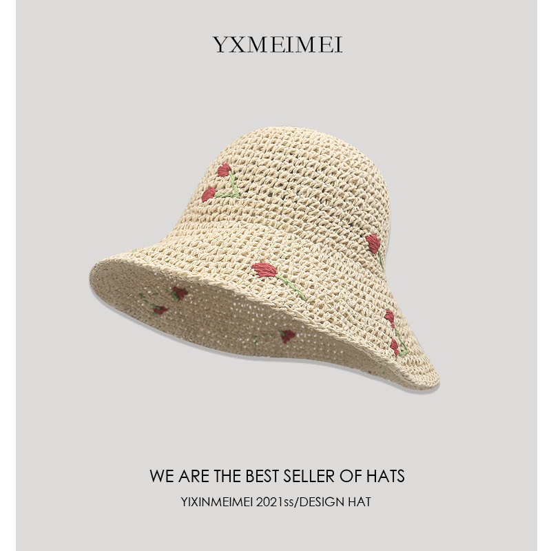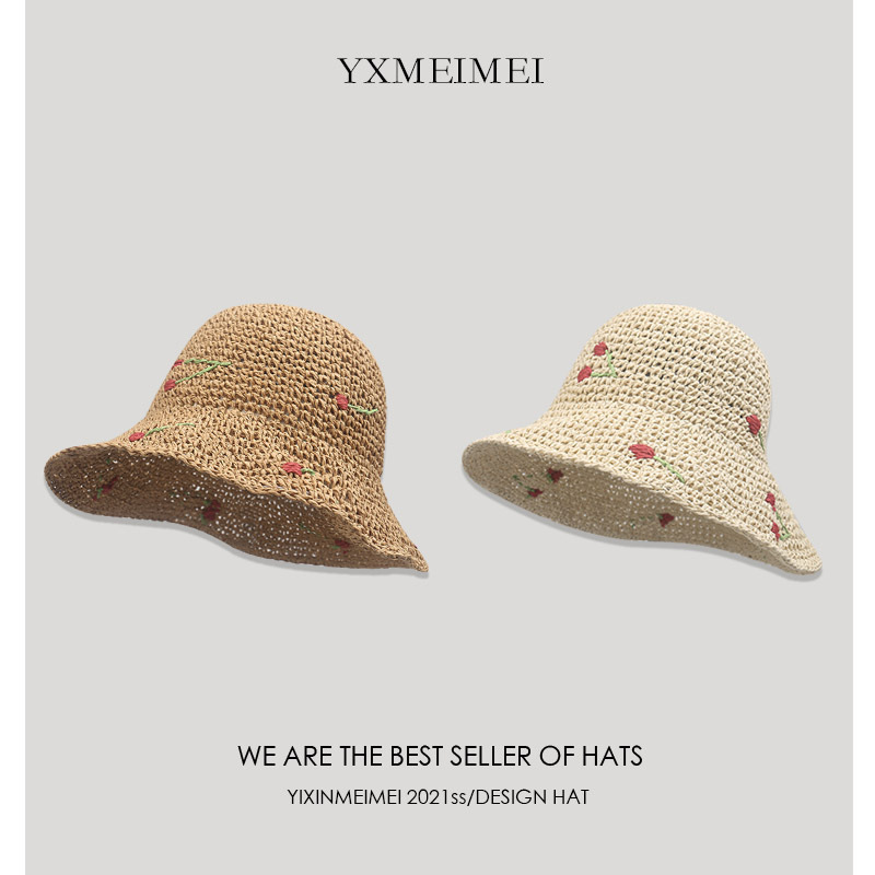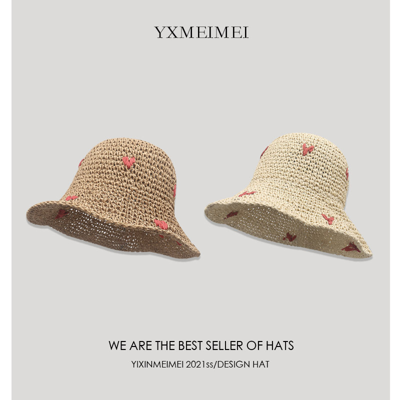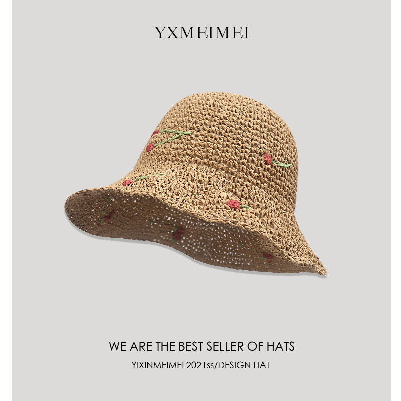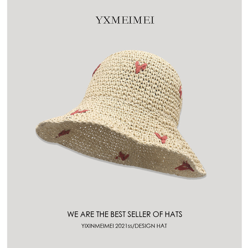 韩版度假风可爱樱桃草编渔夫帽女防晒帽夏季海边沙滩遮阳草帽大檐