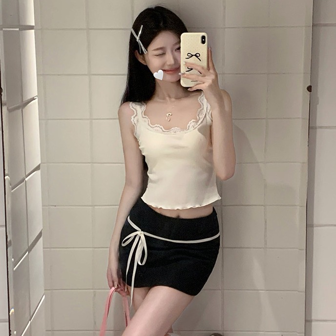 春夏芭蕾风纯欲蕾丝花边荷叶边吊带女温柔甜美bm蕾丝拼接无袖上衣