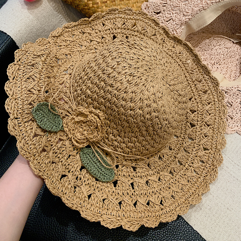 花朵手工编织草帽女可折叠夏季海边度假防晒帽大帽檐遮阳太阳帽子