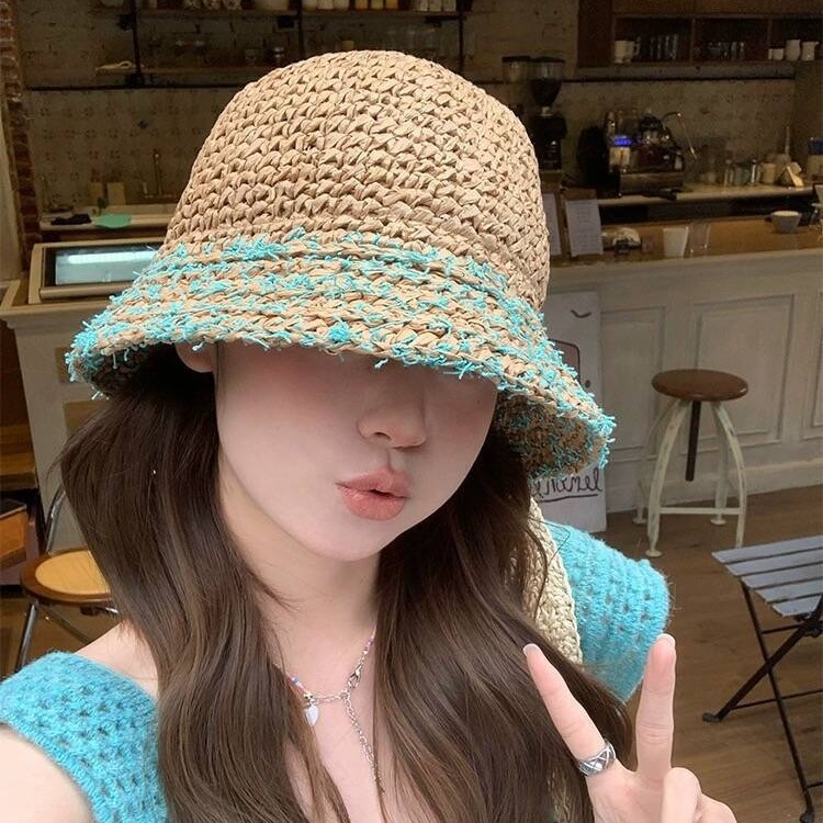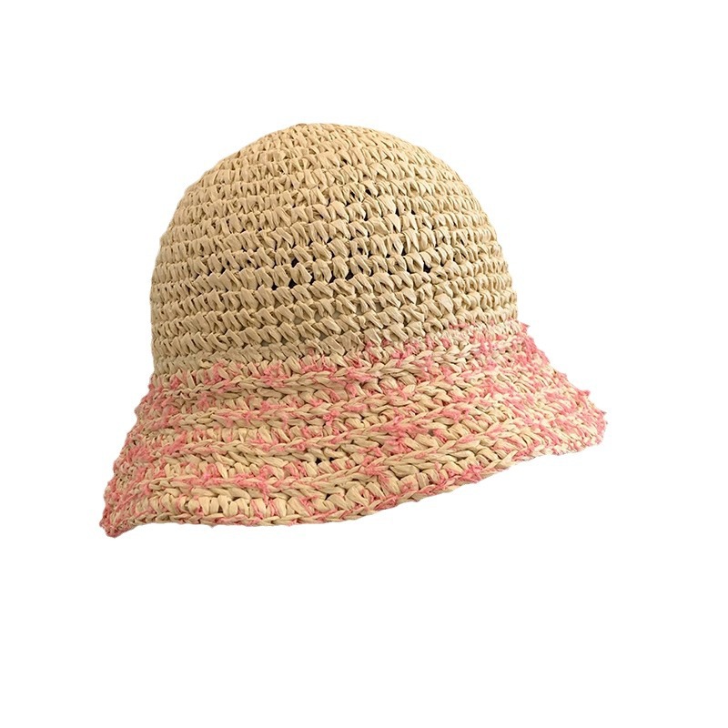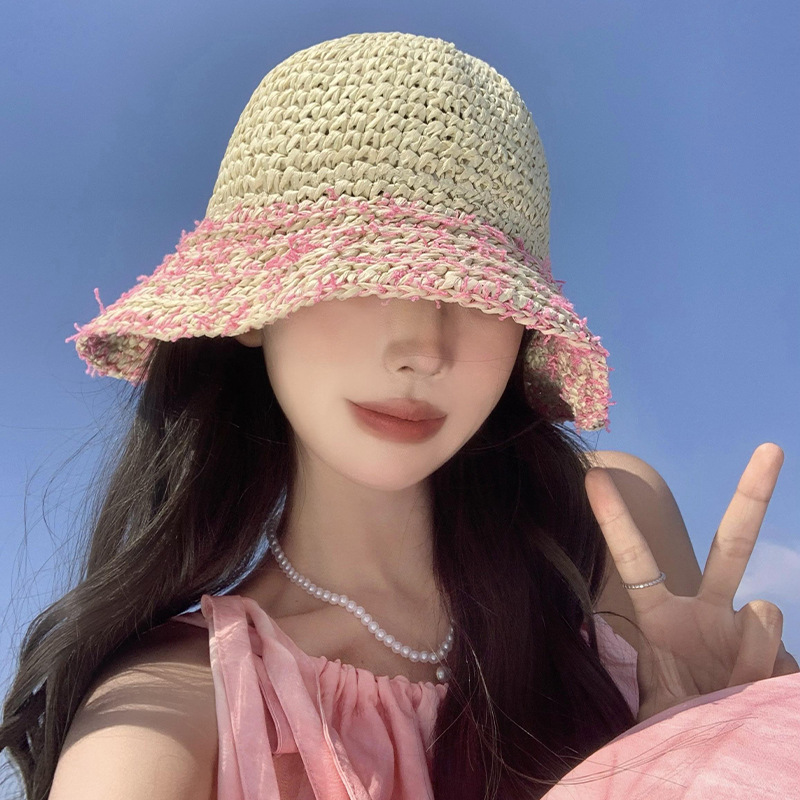 法式粉色草帽女夏海边新款沙滩遮阳帽防晒度假镂空草编帽可折叠