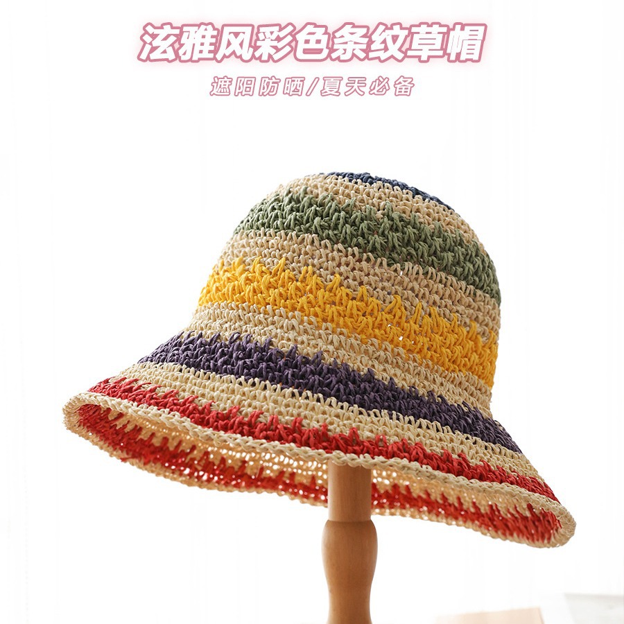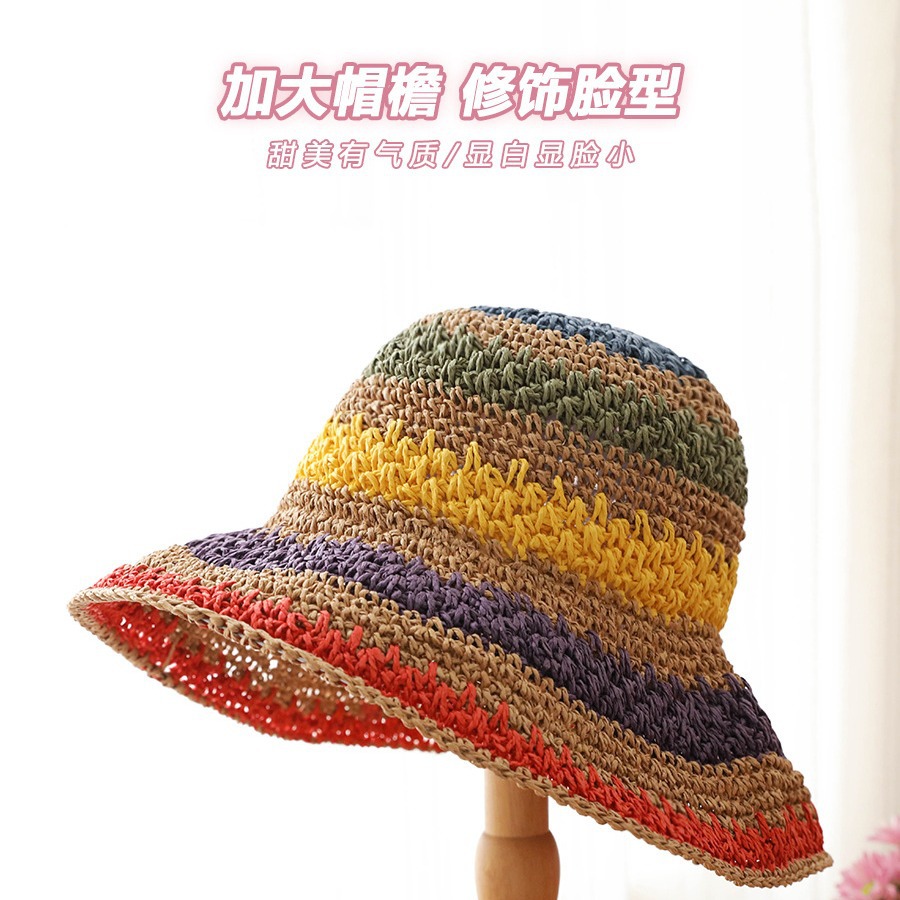 可折叠彩色条纹草帽女春夏季出游甜美防晒帽子时尚撞色编织渔夫帽