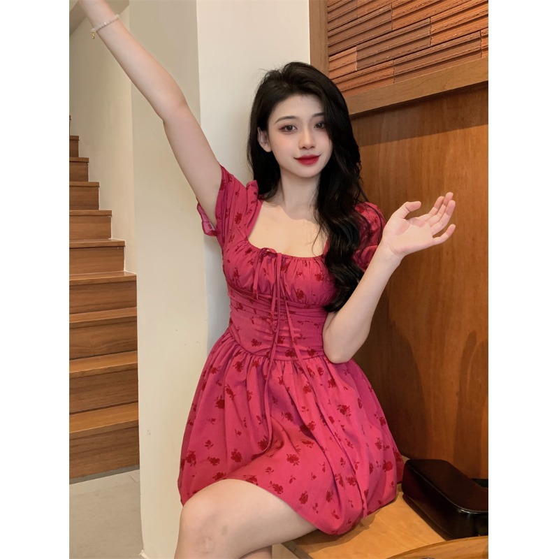甜美泡泡袖方领裙子夏季新款收腰显瘦小众气质短袖连衣裙女