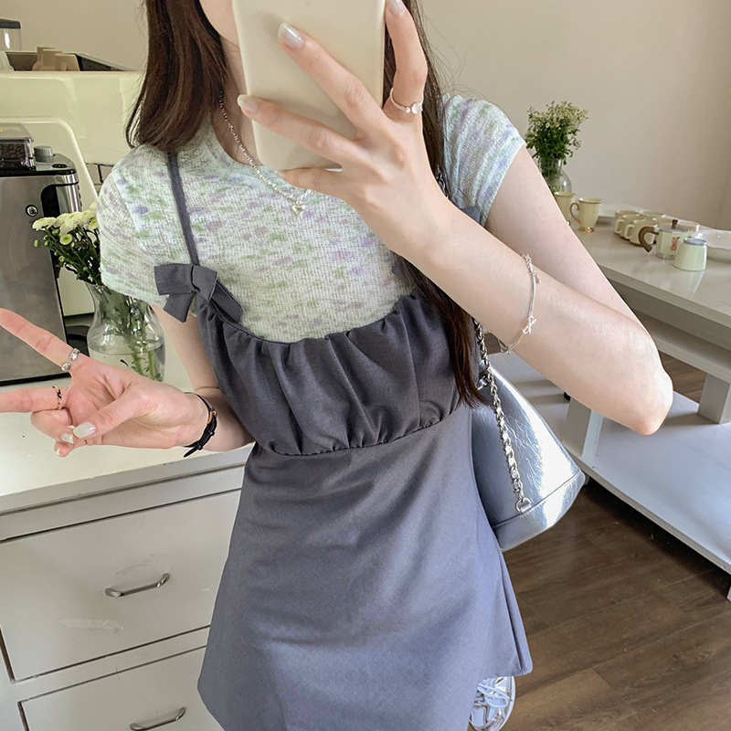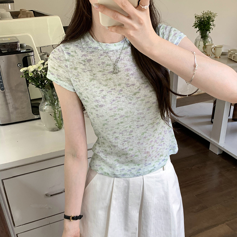 减龄甜美气质紫色碎花绿色短袖T恤女夏季新款爆款正肩短上衣