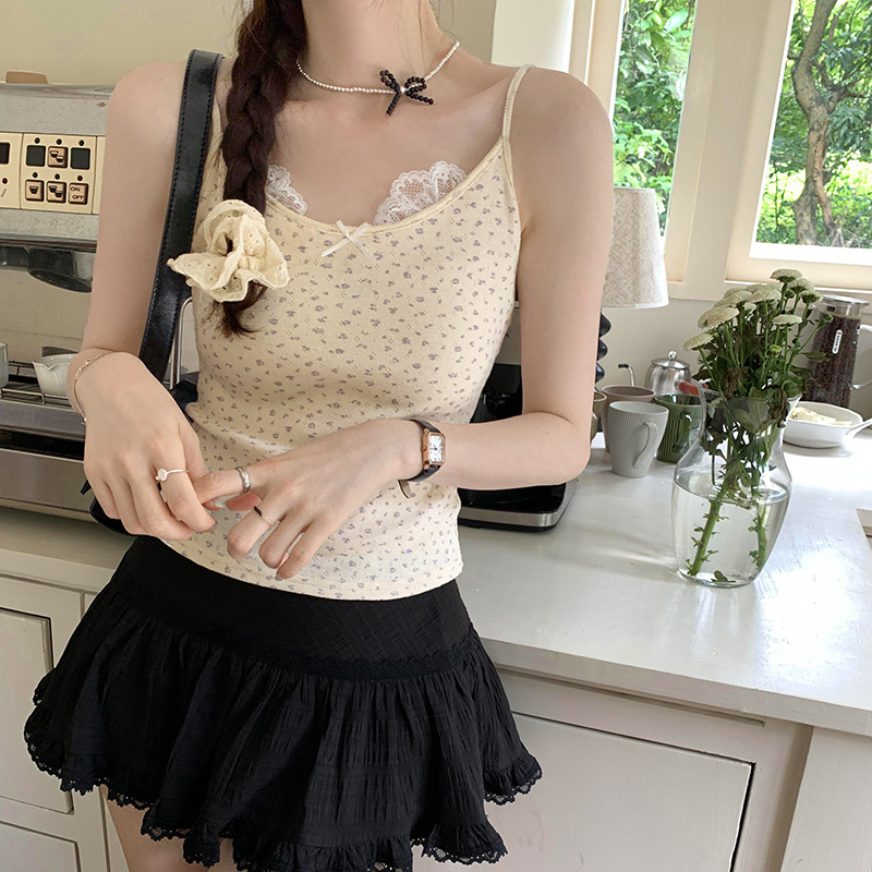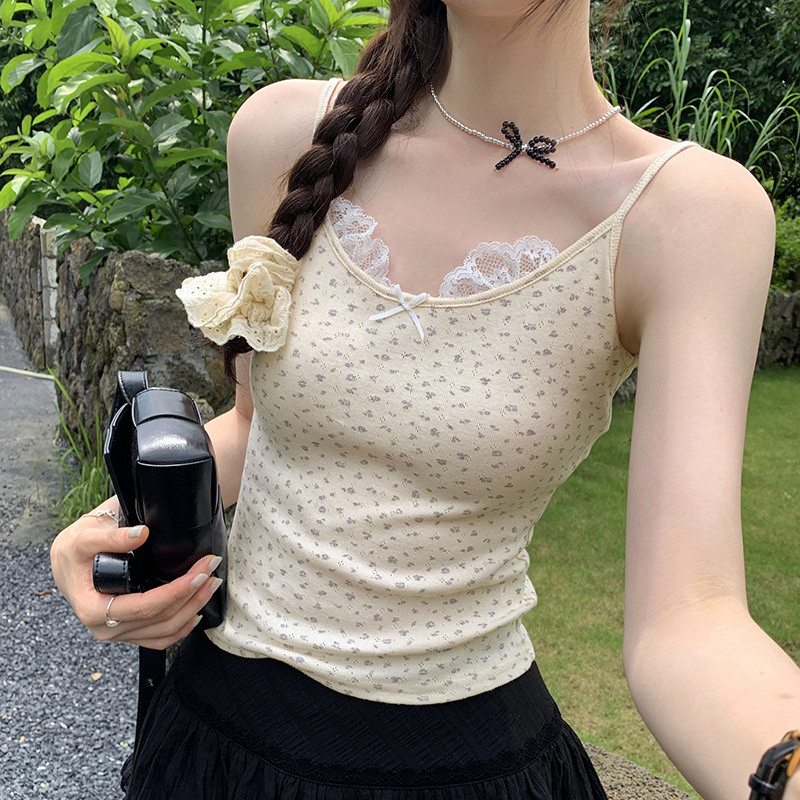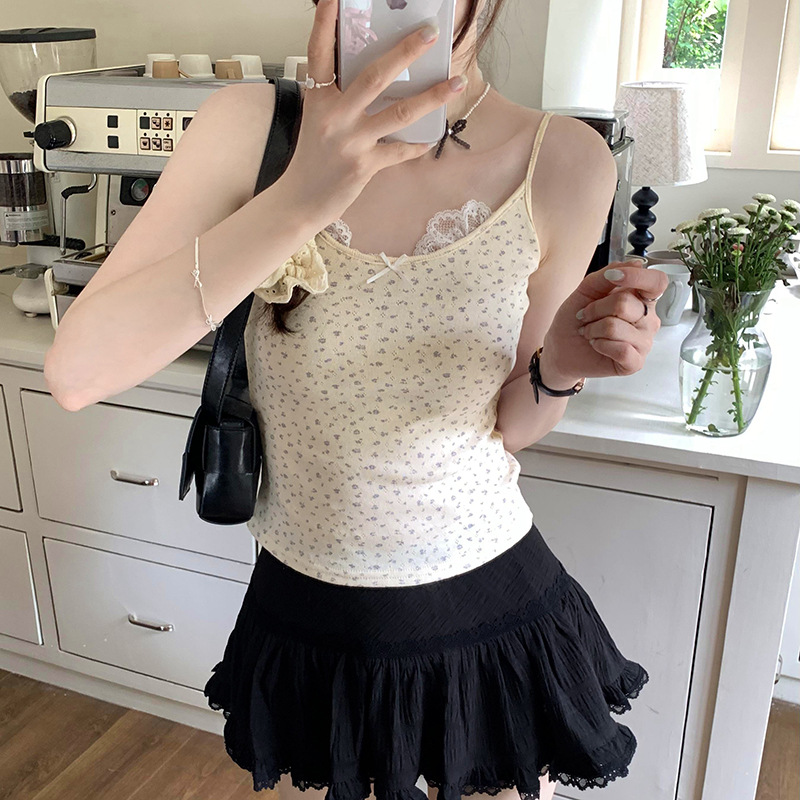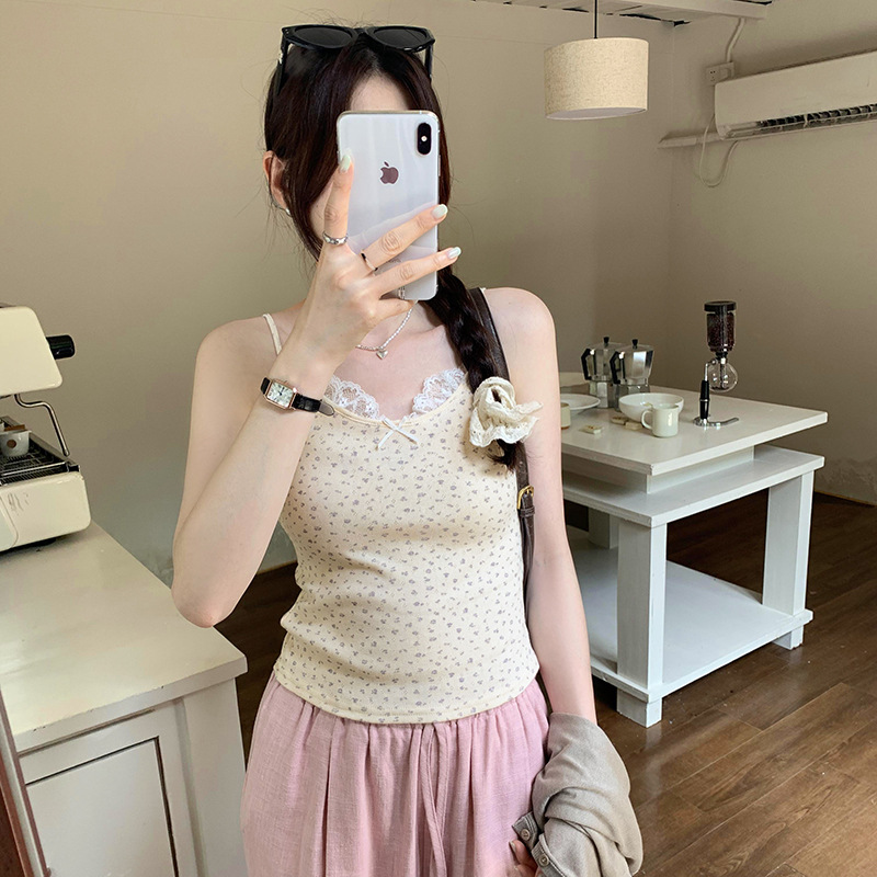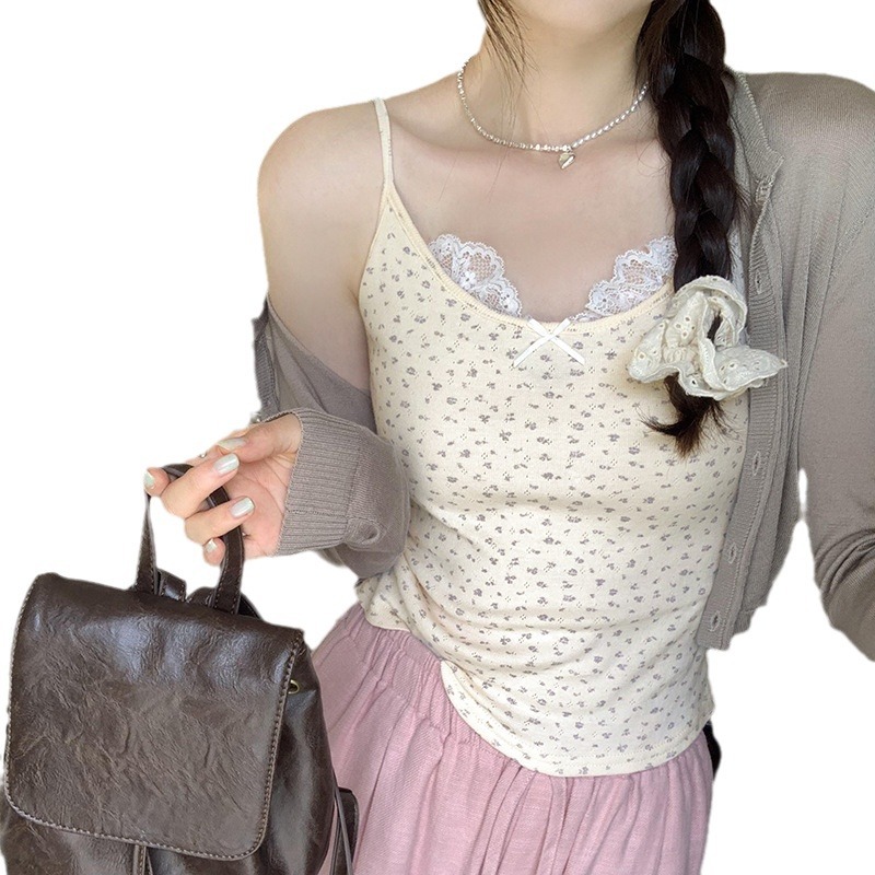 独特精致蕾丝花边蝴蝶结纯棉小碎花吊带女夏新款外穿甜辣上衣